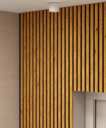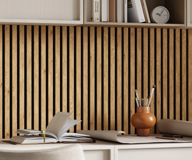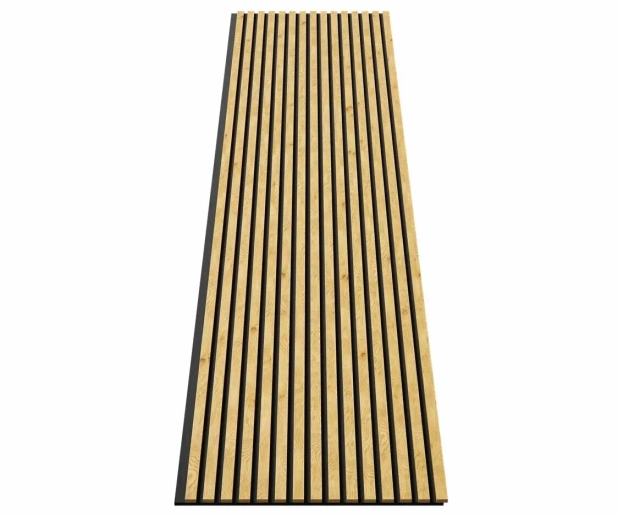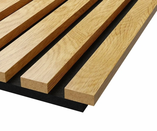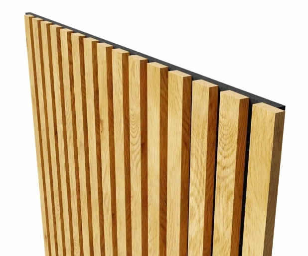 Основа панелей – акустический войлок 9мм. Изготовлен из экологичного волокна, устойчив к влаге, долговечен, воздухопроницаем, подавляет и преломляет звуковые волны. Декор панелей – рейки из черного мебельного МДФ, облицованные шпоном: устойчивы к деформации, привносят в интерьер умиротворение и гармонию, сохраняют связь с природой.
