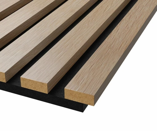 Основа панелей – акустический войлок 9мм. Изготовлен из экологичного волокна, устойчив к влаге, долговечен, воздухопроницаем, подавляет и преломляет звуковые волны. Декор панелей – рейки из черного мебельного МДФ, облицованные шпоном:  устойчивы к деформации, привносят в интерьер умиротворение и гармонию, сохраняют связь с природой.