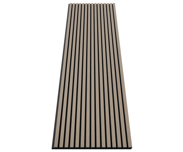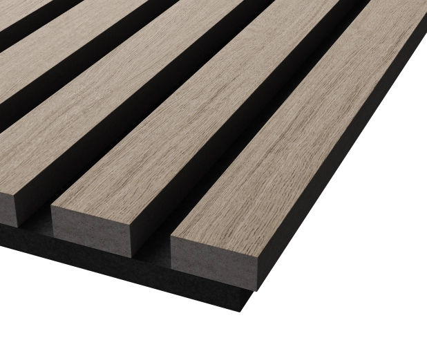 Основа панелей – акустический войлок 9мм. Изготовлен из экологичного волокна, устойчив к влаге, долговечен, воздухопроницаем, подавляет и преломляет звуковые волны. Декор панелей – рейки из черного мебельного МДФ, облицованные шпоном: устойчивы к деформации, привносят в интерьер умиротворение и гармонию, сохраняют связь с природой.