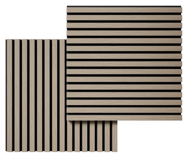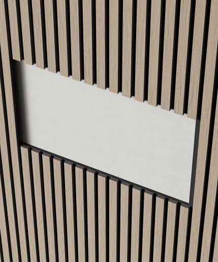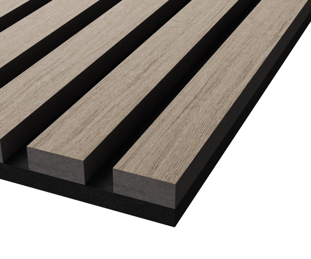 Основа панелей – акустический войлок 9мм. Изготовлен из экологичного волокна, устойчив к влаге, долговечен, воздухопроницаем, подавляет и преломляет звуковые волны. Декор панелей – рейки из черного мебельного МДФ, облицованные шпоном: устойчивы к деформации, привносят в интерьер умиротворение и гармонию, сохраняют связь с природой.
