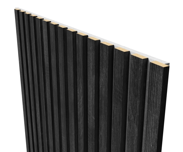Основа панелей – акустический войлок 9мм. Изготовлен из экологичного волокна, устойчив к влаге, долговечен, воздухопроницаем, подавляет и преломляет звуковые волны. Декор панелей – рейки из черного мебельного МДФ, облицованные шпоном: устойчивы к деформации, привносят в интерьер умиротворение и гармонию, сохраняют связь с природой.