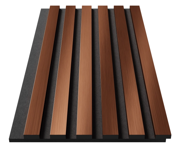 Основа панелей – акустический войлок 9мм. Изготовлен из экологичного волокна, устойчив к влаге, долговечен, воздухопроницаем, подавляет и преломляет звуковые волны. Декор панелей – рейки из экополимера, облицованные металлизированными пленками методом термопереноса: влагостойкие и ударопрочные. Блестящие полированные поверхности усиливают естественный свет, делая пространство больше и ярче, придавая статус и респектабельность интерьеру. Широкая цветовая гамма из 8 цветов: хром, хром матовый, желтое золото, золото матовое, красная медь, шампань, черное зеркало. Ширина панелей 300мм.