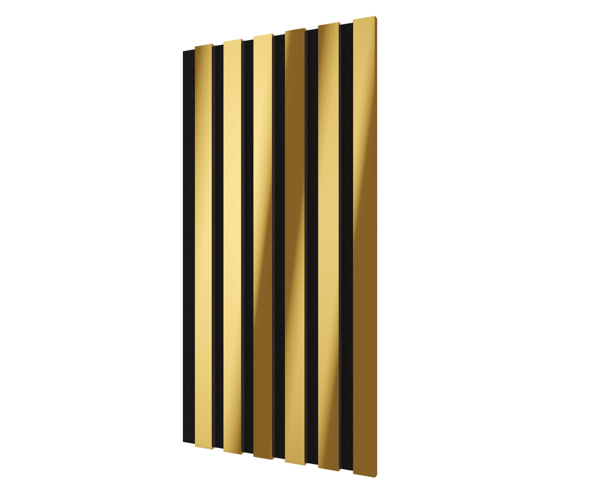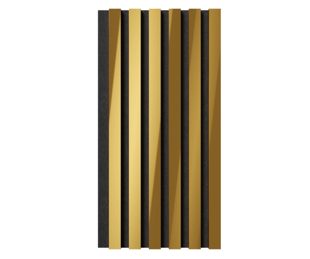 Основа панелей – акустический войлок 9мм. Изготовлен из экологичного волокна, устойчив к влаге, долговечен, воздухопроницаем, подавляет и преломляет звуковые волны. Декор панелей – рейки из экополимера, облицованные металлизированными пленками методом термопереноса: влагостойкие и ударопрочные. Блестящие полированные поверхности усиливают естественный свет, делая пространство больше и ярче, придавая статус и респектабельность интерьеру. Широкая цветовая гамма из 8 цветов: хром, хром матовый, желтое золото, золото матовое, красная медь, шампань, черное зеркало. Ширина панелей 300мм.