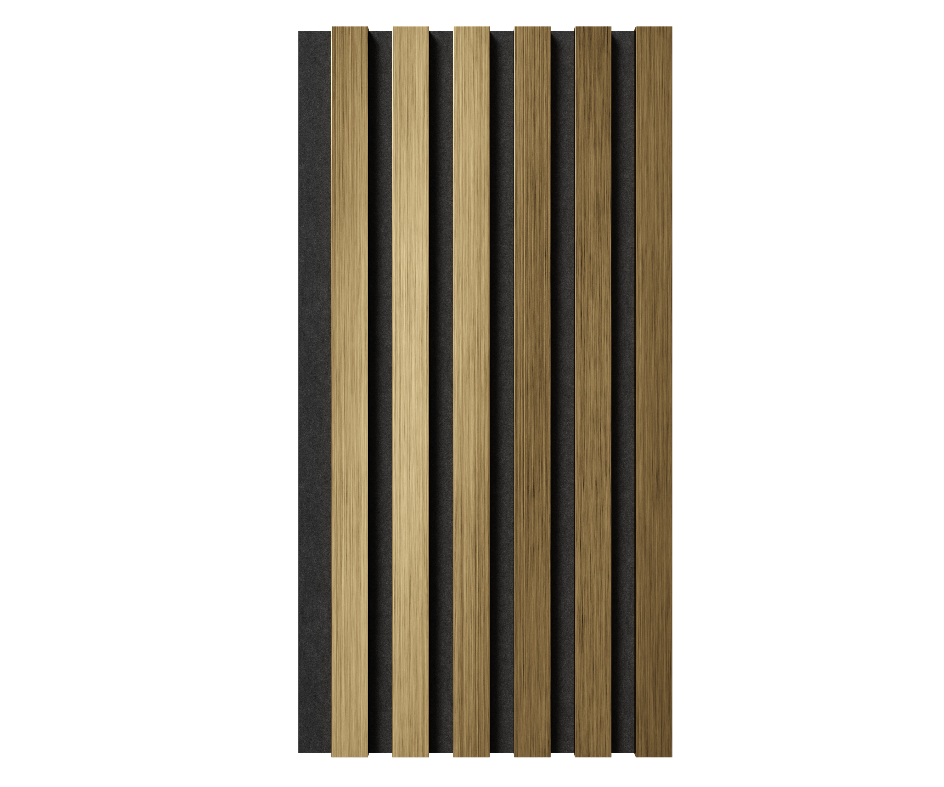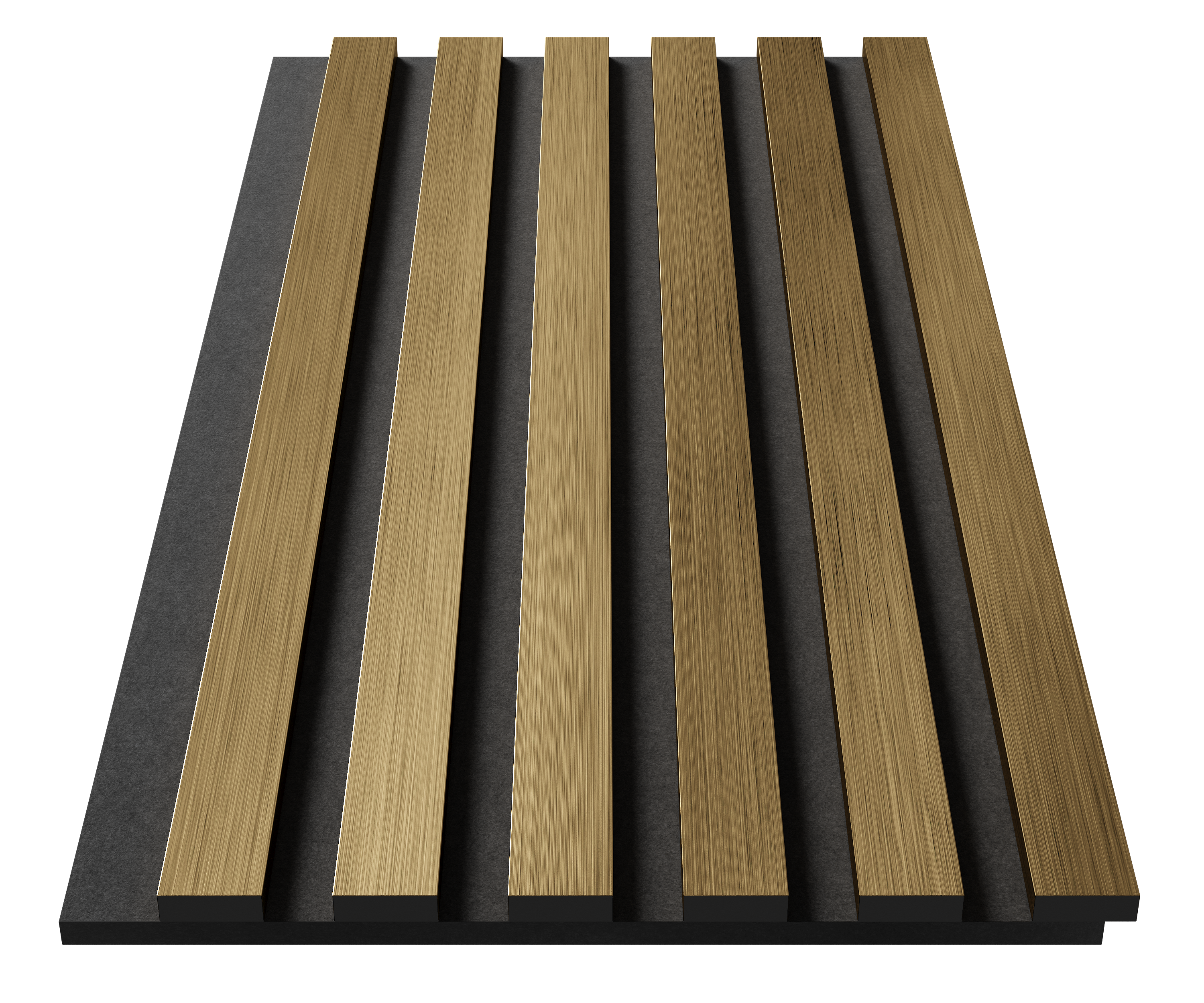 Основа панелей – акустический войлок 9мм. Изготовлен из экологичного волокна, устойчив к влаге, долговечен, воздухопроницаем, подавляет и преломляет звуковые волны. Декор панелей – рейки из экополимера, облицованные металлизированными пленками методом термопереноса: влагостойкие и ударопрочные. Блестящие полированные поверхности усиливают естественный свет, делая пространство больше и ярче, придавая статус и респектабельность интерьеру. Широкая цветовая гамма из 8 цветов: хром, хром матовый, желтое золото, золото матовое, красная медь, шампань, черное зеркало. Ширина панелей 300мм.