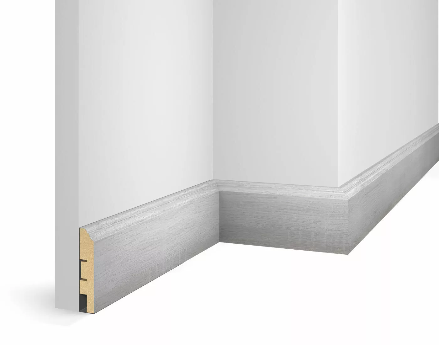 Плинтус WP07, экошпон, дуб Айсберг, 80x16x2400 мм, МДФ. Серия Экошпон. Плинтус Cosca Decor Экошпон имеет декоративное покрытие c 3D эффектом. Особенности производства покрытия, позволили создавать тиснение, которое максимально приближено к натуральному шпону, с визуальными и тактильными ощущениями близкими к натуральной древесине. В составе покрытия многослойная, высококачественная бумага, сочетающая от четырех до шести цветовых оттенков в одном декоре, что дает ощущение перелива и мягкости цвета. Верхний слой покрытия - защитный лак, нанесенный по технологии электронно-лучевого отверждения, что обеспечивают высокую эксплуатационную устойчивость декоративного покрытия.