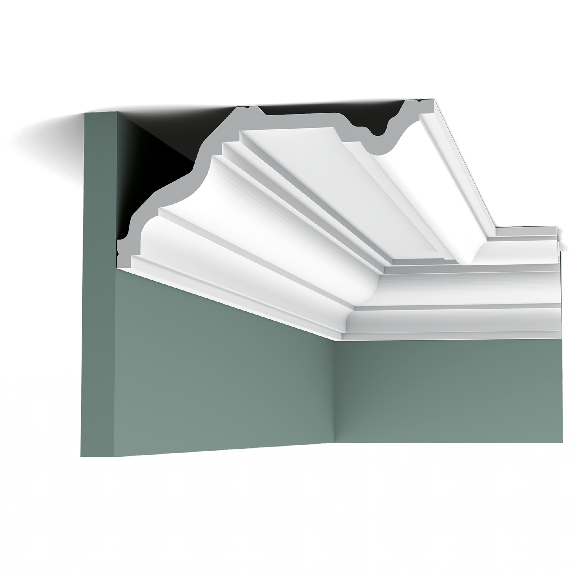 Потолочный плинтус - Дизайн этой большой модели Cotswold позволяет использовать карниз двумя способами. Здесь мы разместили самую длинную сторону карниза на потолке, чтобы визуально расширить помещение. Материал изготовления purotouch. Для соединительных швов лепного декора рекомендуем использовать стыковочный клей на полиуретановой основе FX250.