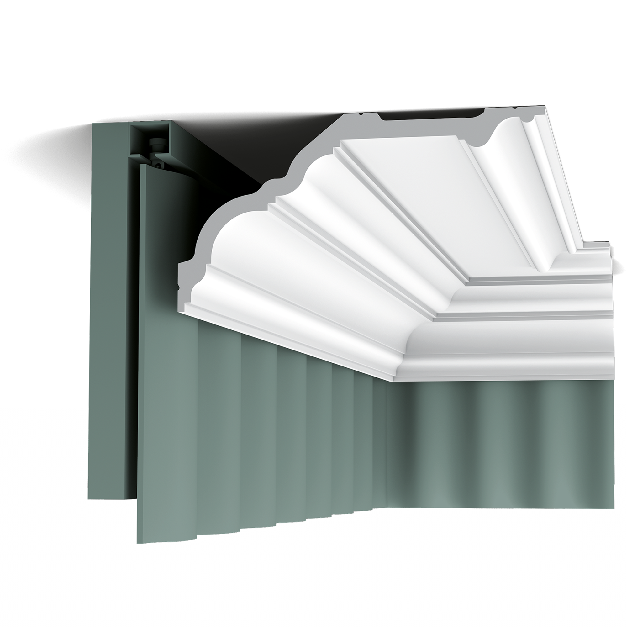 Профиль для штор - Дизайн этой большой модели Cotswold позволяет разместить карниз двумя способами. Здесь мы разместили самую длинную сторону карниза на потолке, чтобы зрительно расширить помещение. Материал изготовления purotouch. Для соединительных швов лепного декора рекомендуем использовать стыковочный клей на полиуретановой основе FX250.