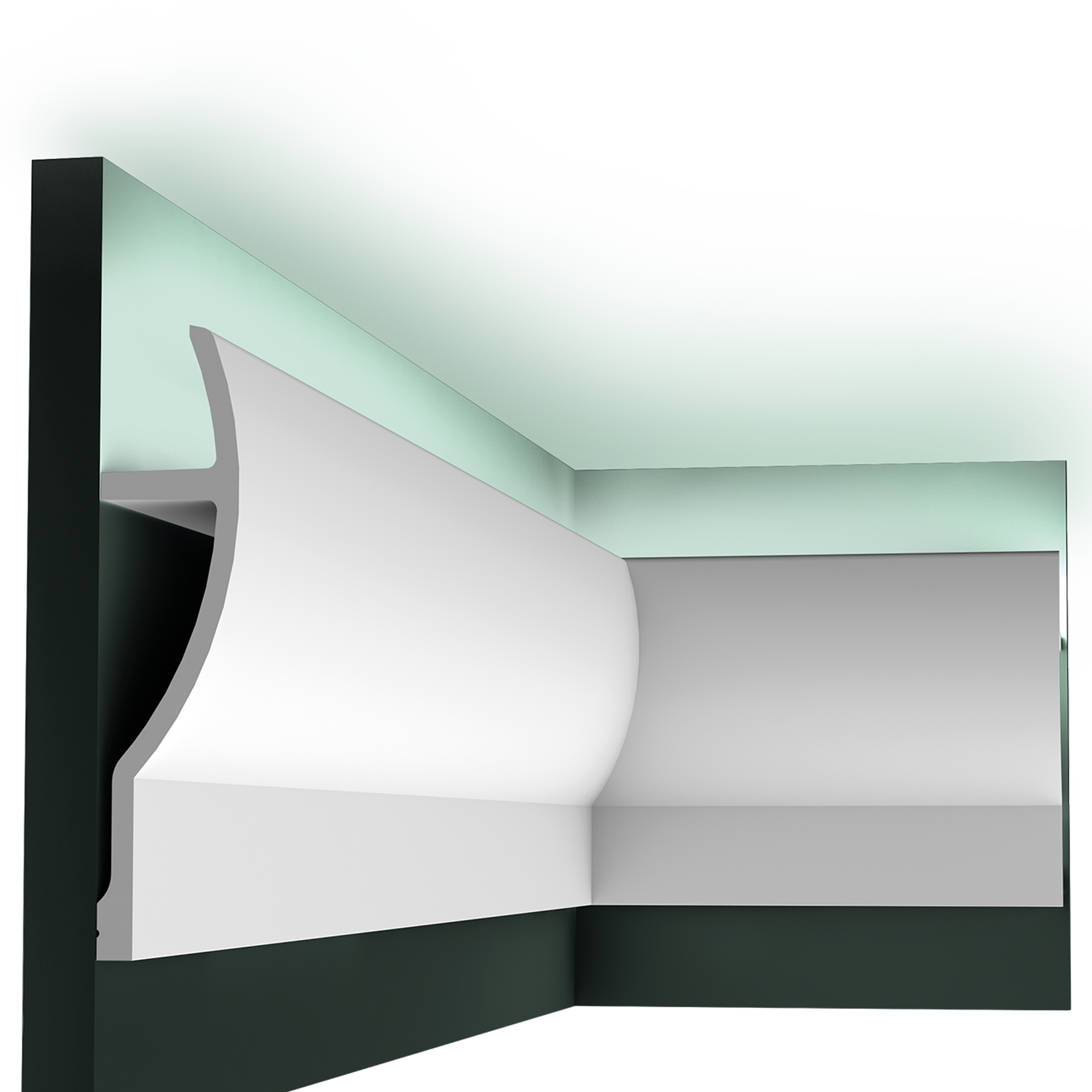 Потолочный плинтус - Великолепная нижняя или верхняя подсветка. Благодаря плавной форме карниз отлично вписывается в любой интерьер. Разработан дизайнером Ульфом Морицем. Материал изготовления purotouch. Для соединительных швов лепного декора рекомендуем использовать стыковочный клей на полиуретановой основе FX250.