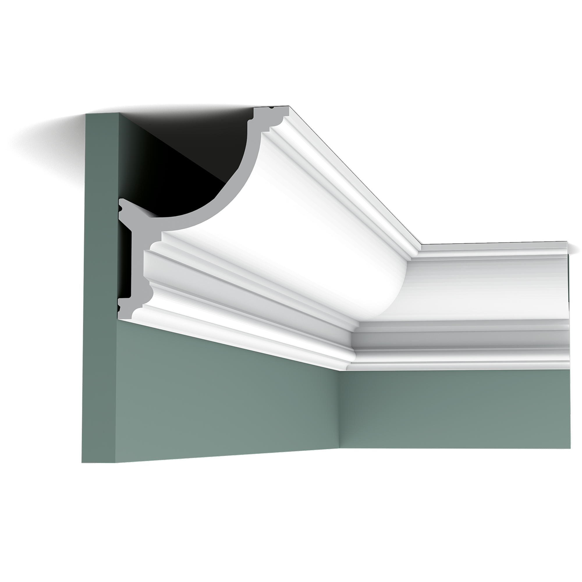 Потолочный плинтус - Большой карниз, навеянный формой Оволо. Плинтус для любого интерьера. Материал изготовления purotouch. Для соединительных швов лепного декора рекомендуем использовать стыковочный клей на полиуретановой основе FX250.
