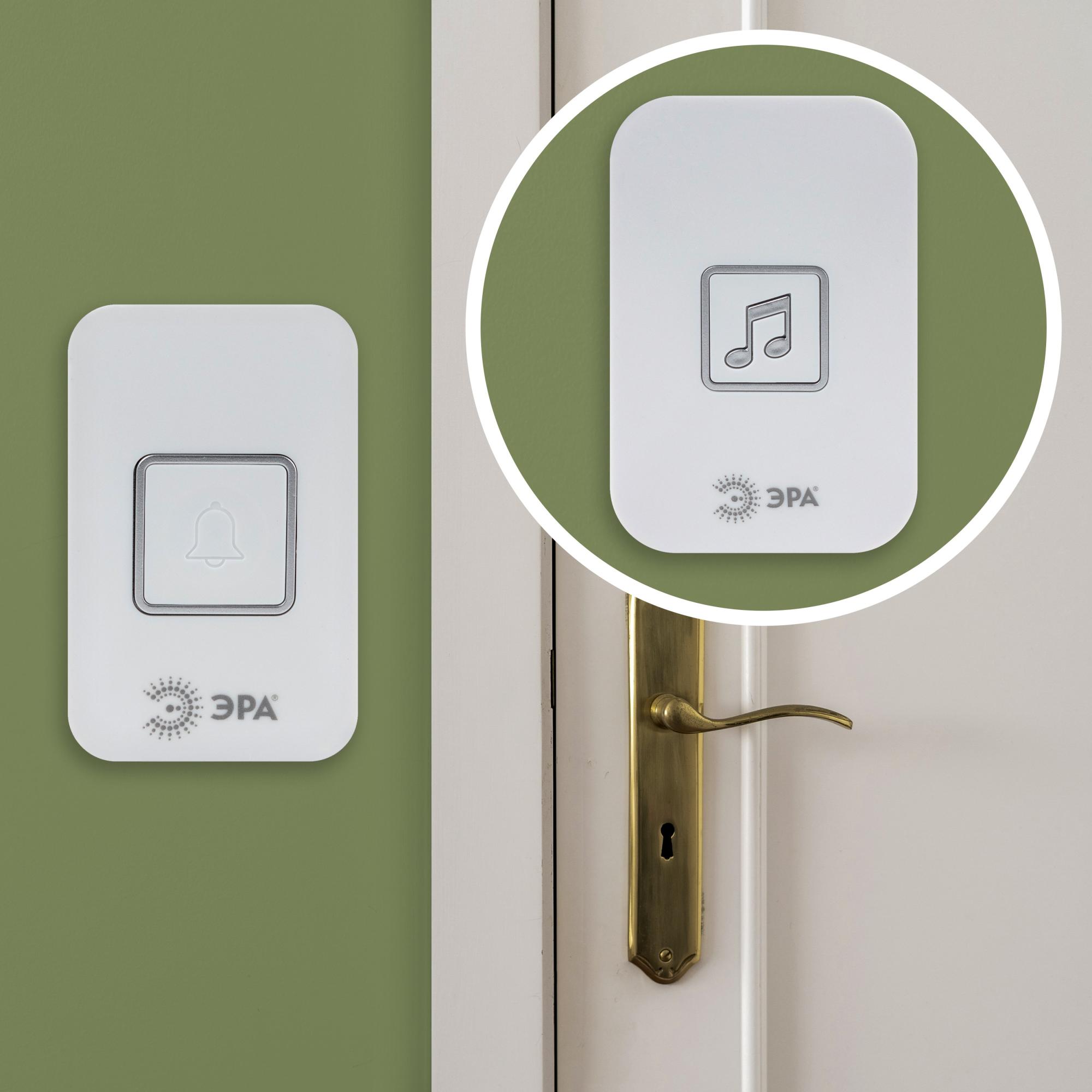 Беспроводной дверной звонок ЭРА С98 с 4 уровнями громкости и 60 полифоническими мелодиями. В линейке представлены: белый звонок дверной - арт. Б0054089, чёрный звонок дверной - арт. Б0054086.