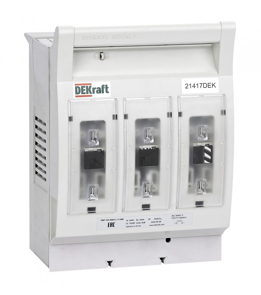 Предохранитель-выключатель-разъединитель горизонтальный (ПВР-102) предназначен для включения и отключения нагрузки с видимым разрывом в сетях трехфазного переменного тока до 400 А частотой 50/60 Гц и номинальным напряжением до 690 В. Трехфазное отключение, навесной монтаж на шины.