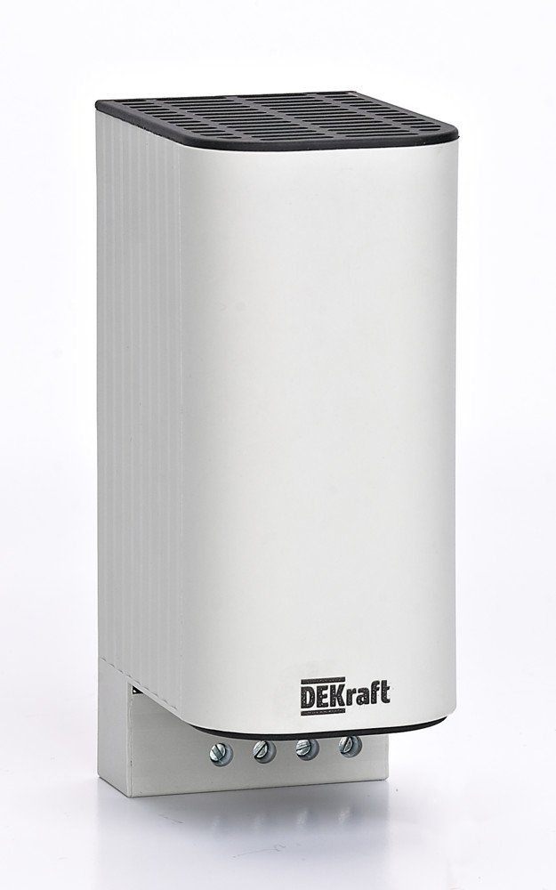 Резистивный нагреватель c защитным кожухом Dekraft. Мощность нагрева 150 Вт. Напряжение питающей сети - 110 - 250 В АС. Монтаж на DIN-рейку, предназначен для поддержания оптимальной температуры воздуха внутри электротехнических шкафов. Он создает конвекционный поток воздуха, который предотвращает образование зон с низкой температурой. Также он защищает электрические компоненты от образования конденсата и замерзания при перепадах температуры, а также от коррозии металлических элементов активного оборудования.