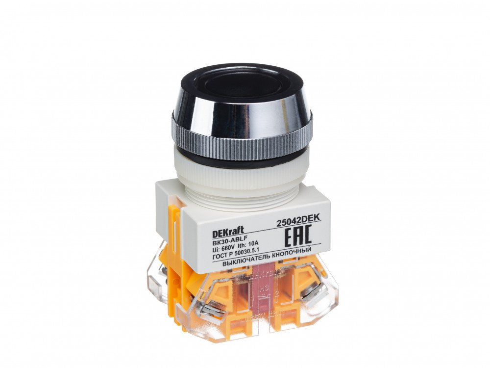Выключатель кнопочный серии ВК-30 Dekraft; с потайным толкателем; черный; без индикации; ном.ток 10 А; установка - на панели или двери; степень защиты - IP54; подключение - винтовыми зажимами. Выключатели кнопочные ВК-30 предназначены для коммутации электрических цепей и индикации состояния электрических цепей. Применяются в сетях переменного тока частотой 50/60 Гц с напряжением до 660В. Могут устанавливаться на подвижных и неподвижных частях стационарных установок.