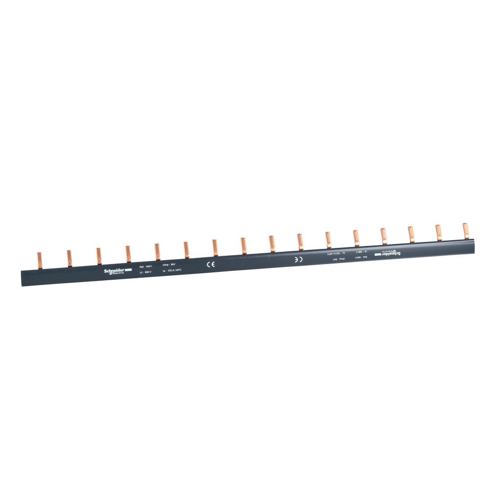 ГРЕБЕНЧАТАЯ ШИНКА ОДНОПОЛЮСНАЯ ШАГ 27ММ. Использование гребенчатых шинок упрощает установку оборудования. Они могут быть разрезаны за один заход. В комплект входят 2 боковые заглушки IP20. После разрезания шинки установка заглушек обязательна. На каждую сторону шинки нанесена маркировка для идентификации фаз при установке во всех позициях. Места разрезов помечены на изоляции.