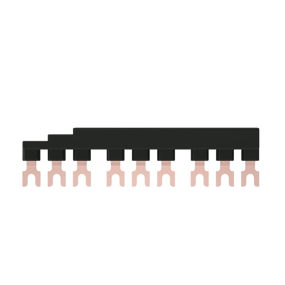 Комплект трехполюсных шин для автоматических выключателей серии SystemePact GM2, на номинальный ток до 63А, исполнение – 3 модуля по 45 мм, монтаж – сверху выключателей. Шины предназначены для правильного и надежного подключения к источнику питания нескольких автоматических выключателей, установленных на одну DIN-рейку.