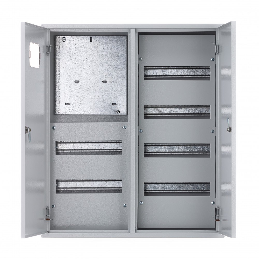 Щит распределительный учетный серии ЩРУН Dekraft; навесной; для трехфазного счетчика; номинальный ток до 125 А; исполнение – 72 мод. х 18 мм, 6 рядов по 12 мод. каждый; ВхШхГ - 680х585х160 мм; материал – сталь; цвет - серый (RAL 7035); степень защиты - IP31. Щиты ЩРУН имеют монтажную панель для крепления счетчика, DIN-рейки для модульной аппаратуры, элементы крепления шин N и PE, болты заземления на дверце и на корпусе, дверь с замком и ключом. Ввод кабелей осуществляется сверху или снизу.