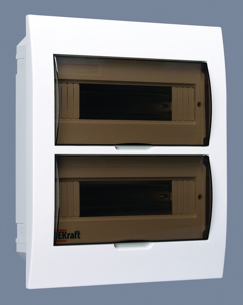 Корпус является встраиваемым, имеет 2 черных DIN-рейки и 24 модулей (18 мм) для установки устройств, изолированные держатели для шинок, шинки N и PE. Дверцы на каждый ряд фиксируются в верхнем положении. Щиток на 100% совместим с модульным оборудованием Dekraft и Systeme Electric.