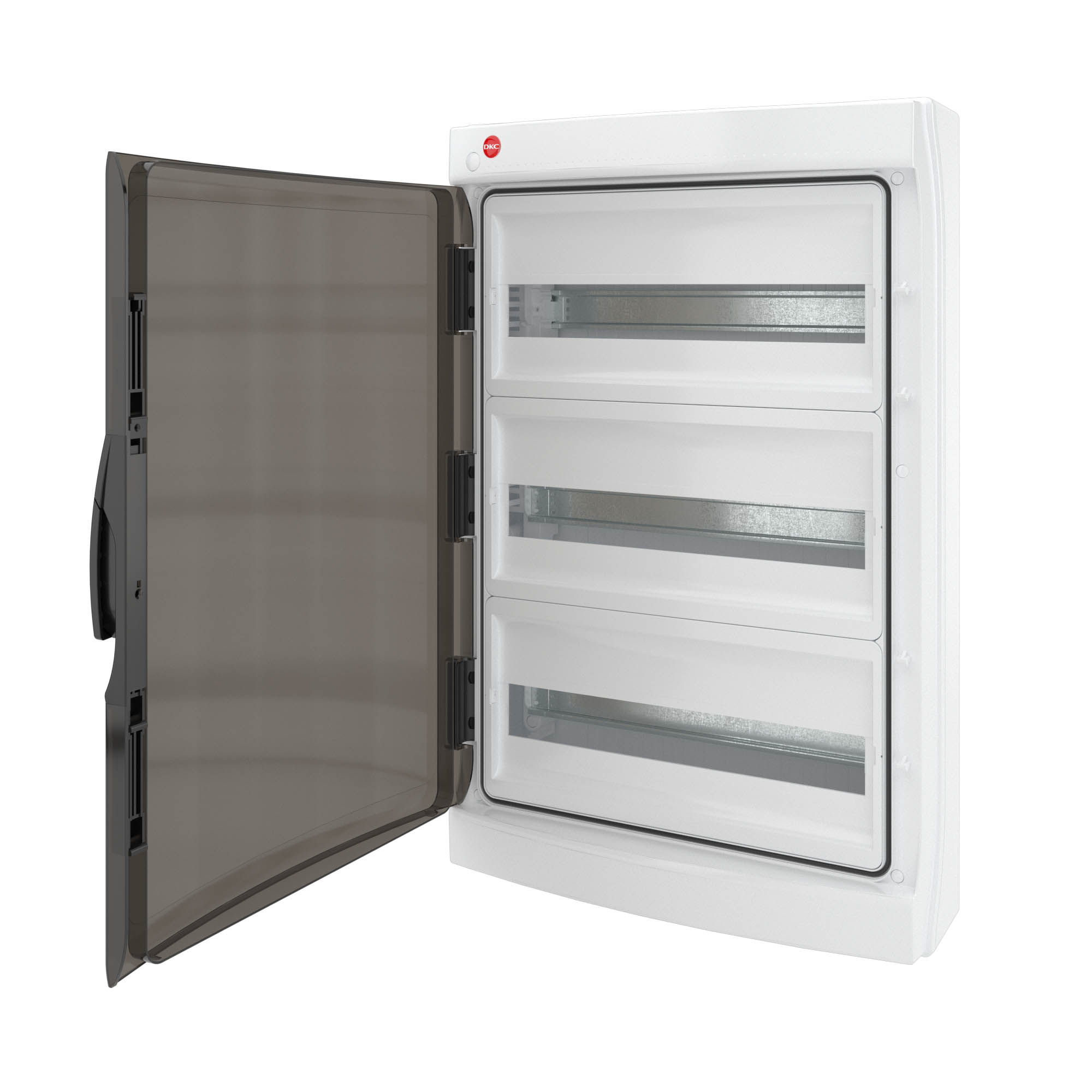 Настенный модульный щиток предназначен для монтажа в жилых и административных помещениях для установки автоматических выключателей любых производителей: таймеров, устройств защитного отключения и управления освещением и т.д. В комплект поставки входят: ручка на дверце, оцинкованная DIN-рейка и суппорт, заглушки для пустых модулей, заглушки с двойной изоляцией на пазы для крепления к стене, сборочные винты. Преперфорированные отверстия и насечки на задней стенке обеспечивают точное соединение с пластиковыми трубами и обеспечивают легкий монтаж. Специальная конструкция петель дает возможность открывать дверцу более чем на 180. Степень пыле- и влагозащиты IP 65. Количество модулей - 54(3х18). Параметры щитка: ширина - 657 мм, высота - 312 мм, глубина - 148 мм. Материал - термостойкий пластик. Цвет - серый..