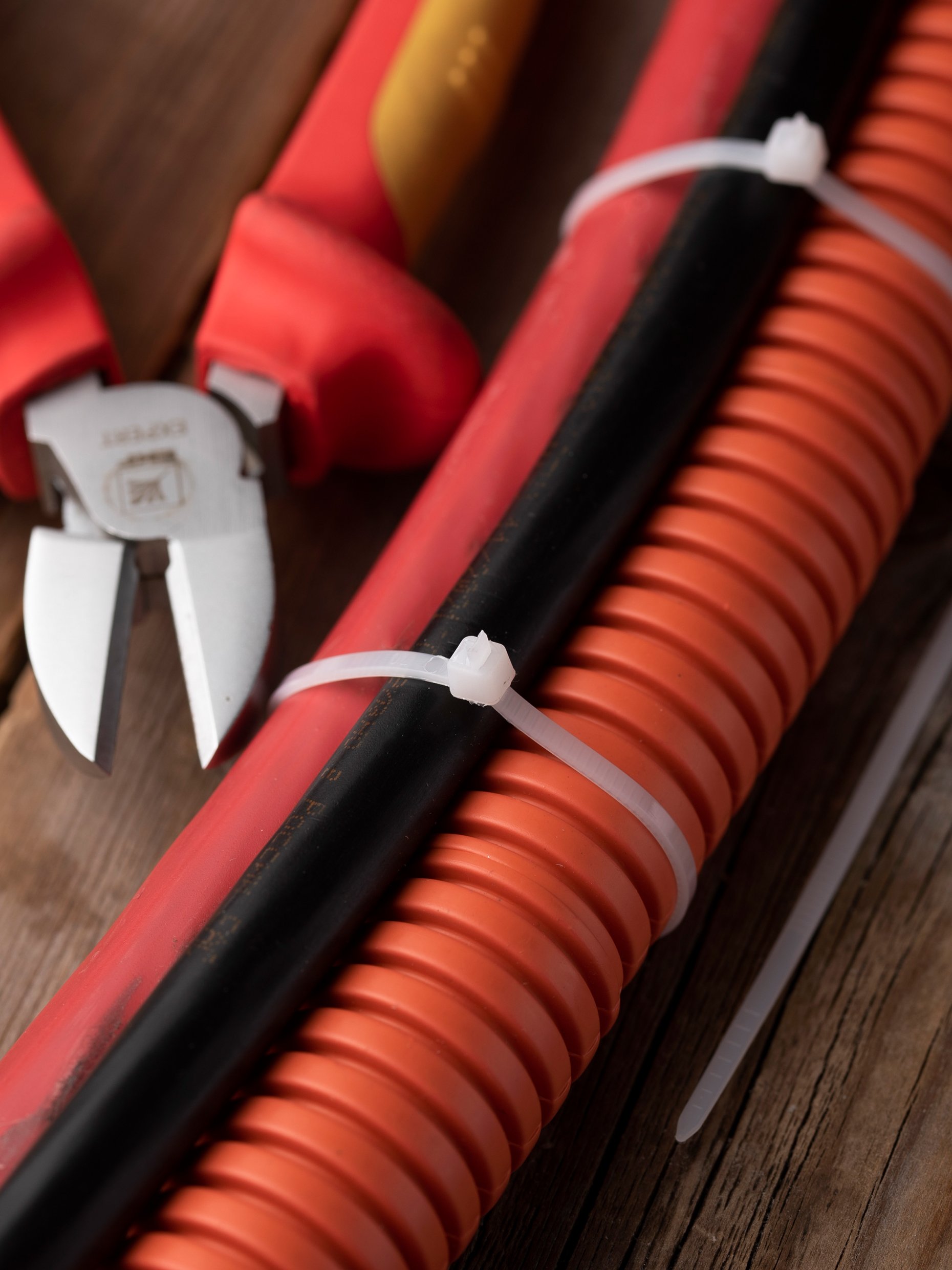 Предназначен для увязки кабелей и проводов в пучок и монтажа кабельных линий и проводников. Ремешок самофиксирующийся, блокирующий механизм. Изготовлен из Nylon 6.6, устойчивого к старению, коррозии, воздействию солей, ультрафиолета, кислот, щелочей, спирта, бензина и масел. При производстве кабельных стяжек черного цвета добавляется угольный порошок, который является одним из наиболее эффективных стабилизаторов. Он улучшает физические свойства продукции в стойкости к погодным условиям и УФ-излучению (прямые солнечные лучи).
