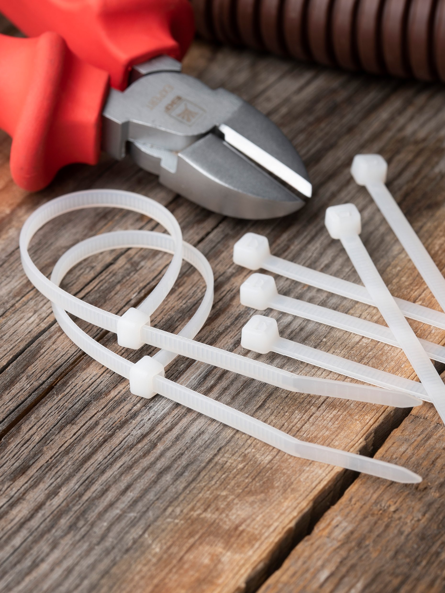 Предназначен для увязки кабелей и проводов в пучок и монтажа кабельных линий и проводников. Ремешок самофиксирующийся, блокирующий механизм. Изготовлен из Nylon 6.6, устойчивого к старению, коррозии, воздействию солей, ультрафиолета, кислот, щелочей, спирта, бензина и масел. При производстве кабельных стяжек черного цвета добавляется угольный порошок, который является одним из наиболее эффективных стабилизаторов. Он улучшает физические свойства продукции в стойкости к погодным условиям и УФ-излучению (прямые солнечные лучи).