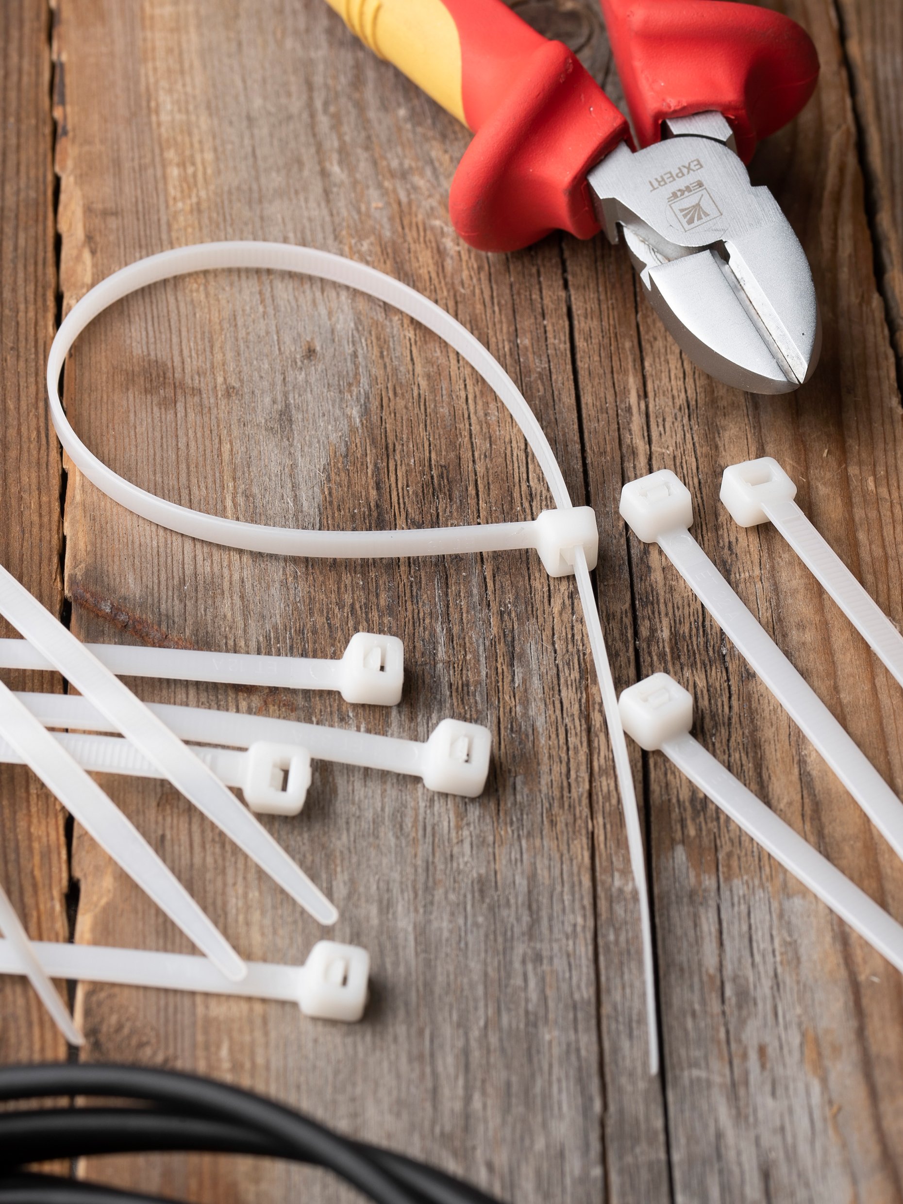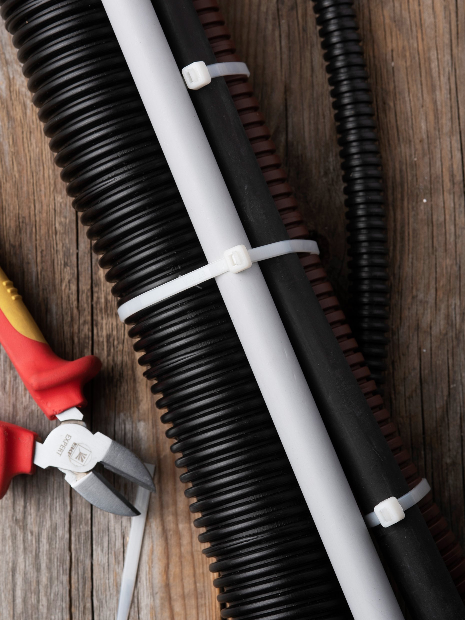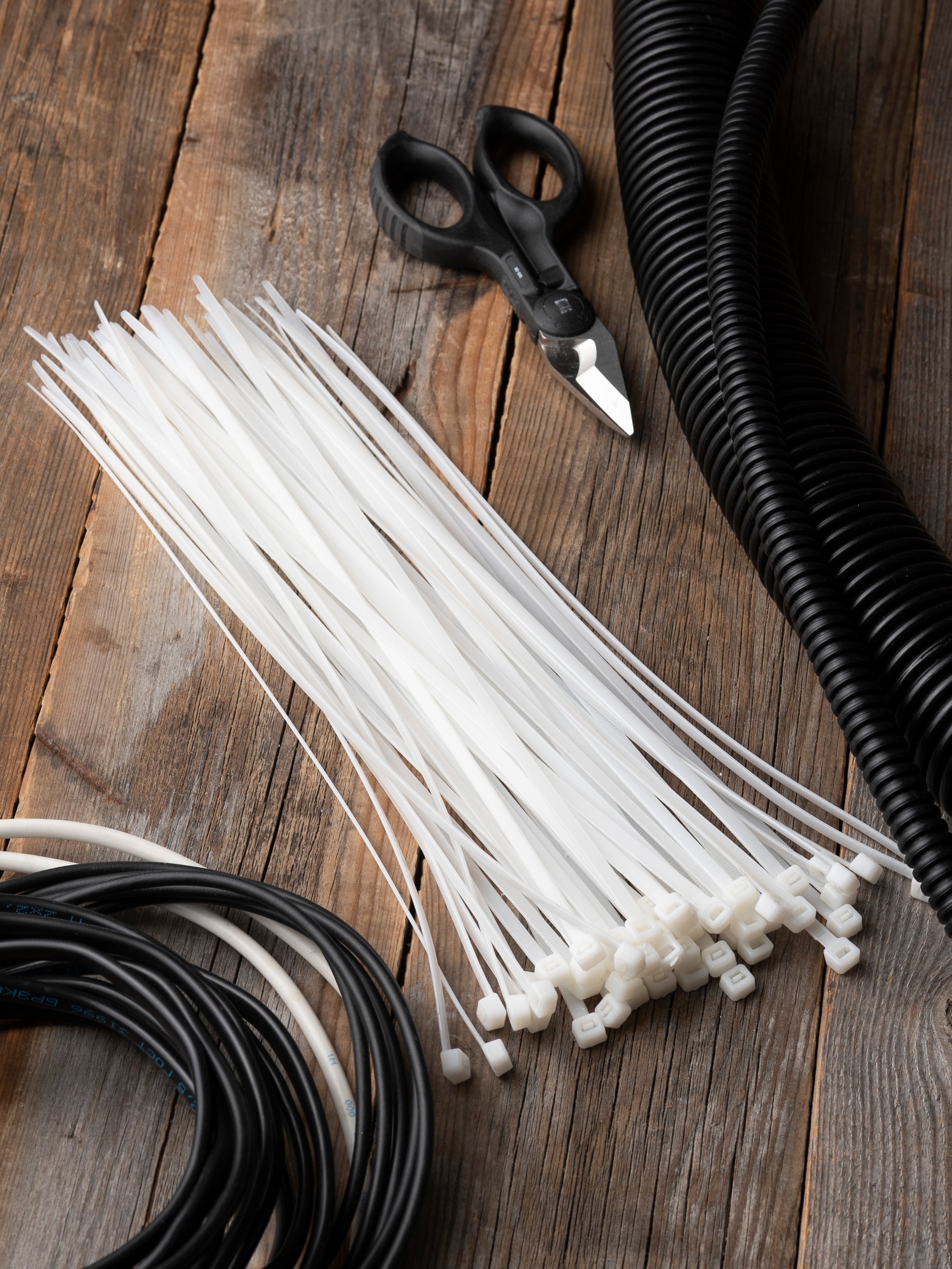 Предназначен для увязки кабелей и проводов в пучок и монтажа кабельных линий и проводников. Ремешок самофиксирующийся, блокирующий механизм. Изготовлен из Nylon 6.6, устойчивого к старению, коррозии, воздействию солей, ультрафиолета, кислот, щелочей, спирта, бензина и масел. При производстве кабельных стяжек черного цвета добавляется угольный порошок, который является одним из наиболее эффективных стабилизаторов. Он улучшает физические свойства продукции в стойкости к погодным условиям и УФ-излучению (прямые солнечные лучи).