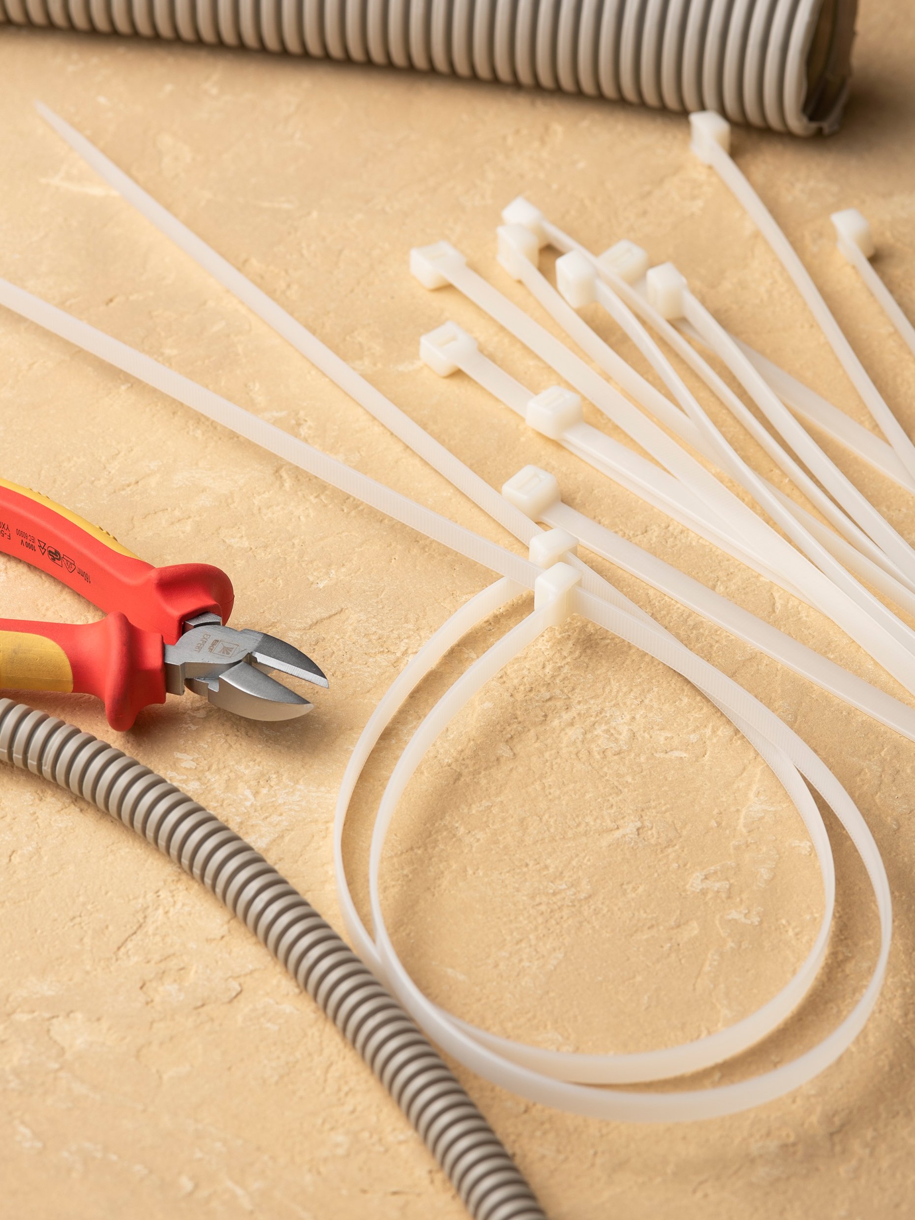 Предназначен для увязки кабелей и проводов в пучок и монтажа кабельных линий и проводников. Ремешок самофиксирующийся, блокирующий механизм. Изготовлен из Nylon 6.6, устойчивого к старению, коррозии, воздействию солей, ультрафиолета, кислот, щелочей, спирта, бензина и масел. При производстве кабельных стяжек черного цвета добавляется угольный порошок, который является одним из наиболее эффективных стабилизаторов. Он улучшает физические свойства продукции в стойкости к погодным условиям и УФ-излучению (прямые солнечные лучи).