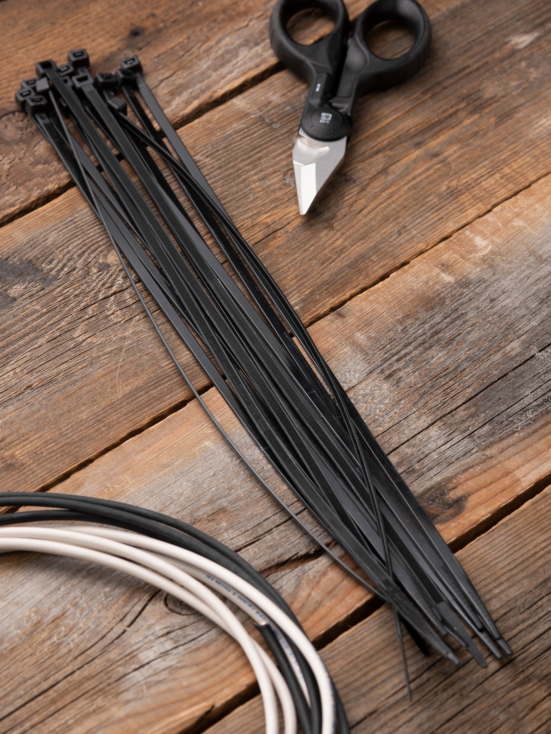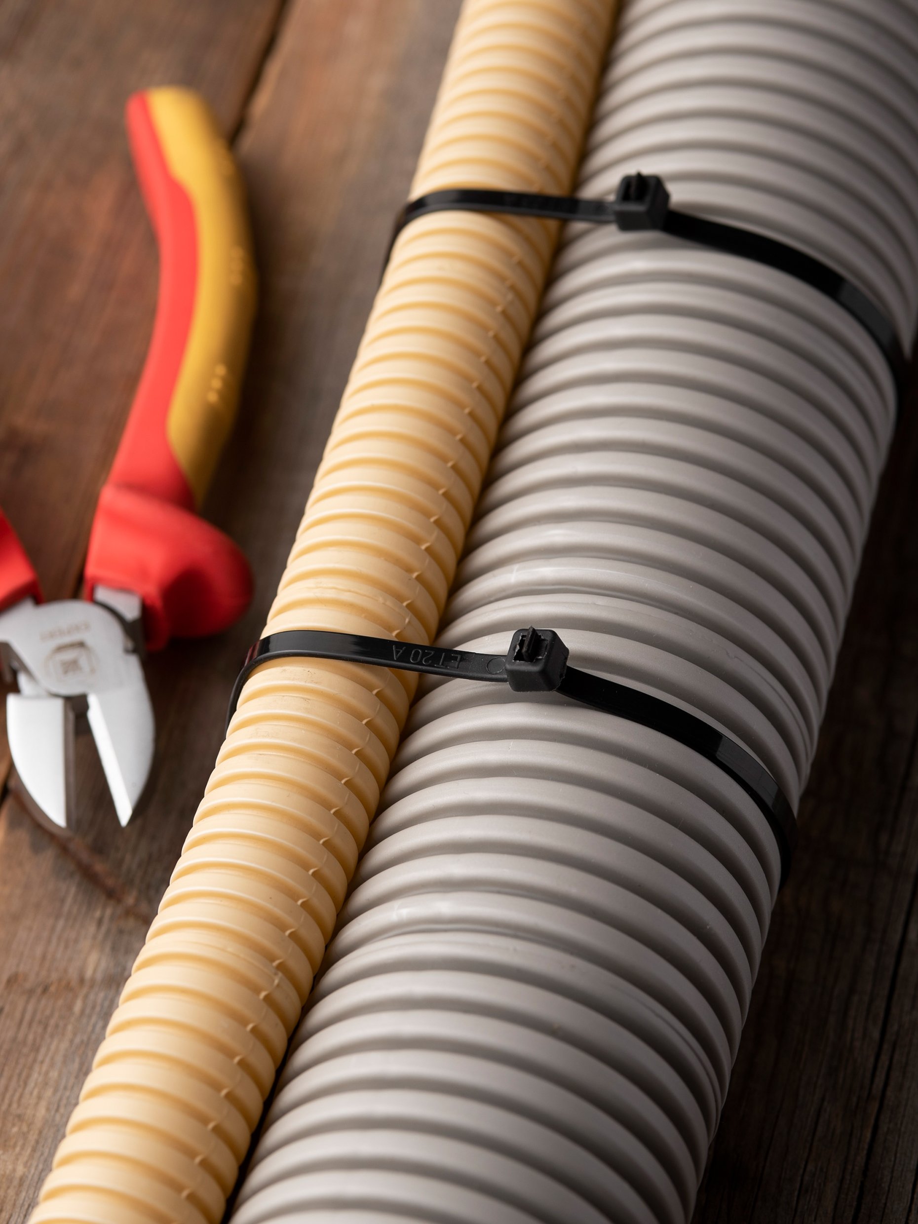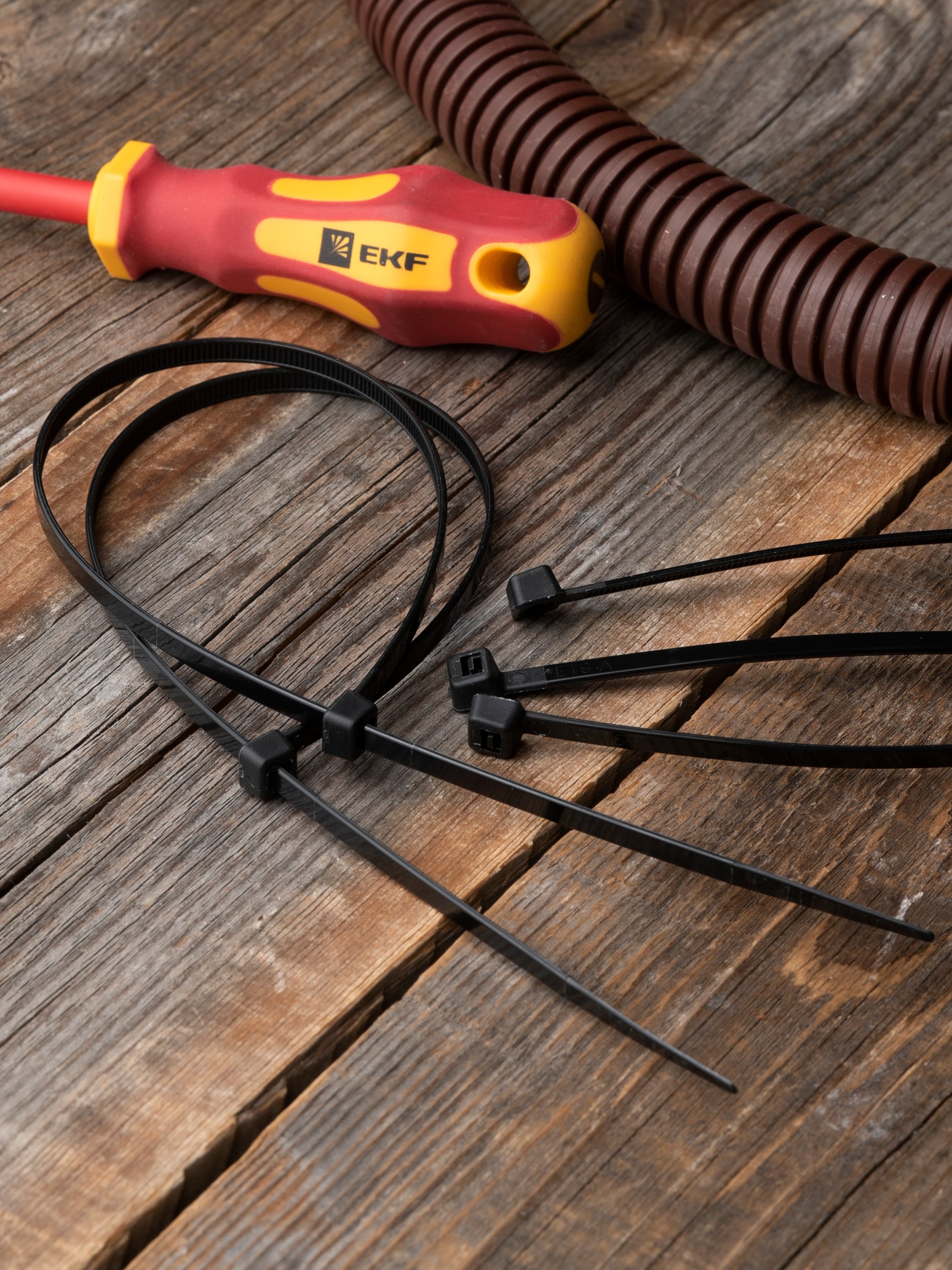 Предназначен для увязки кабелей и проводов в пучок и монтажа кабельных линий и проводников. Ремешок самофиксирующийся, блокирующий механизм. Изготовлен из Nylon 6.6, устойчивого к старению, коррозии, воздействию солей, ультрафиолета, кислот, щелочей, спирта, бензина и масел. При производстве кабельных стяжек черного цвета добавляется угольный порошок, который является одним из наиболее эффективных стабилизаторов. Он улучшает физические свойства продукции в стойкости к погодным условиям и УФ-излучению (прямые солнечные лучи).
