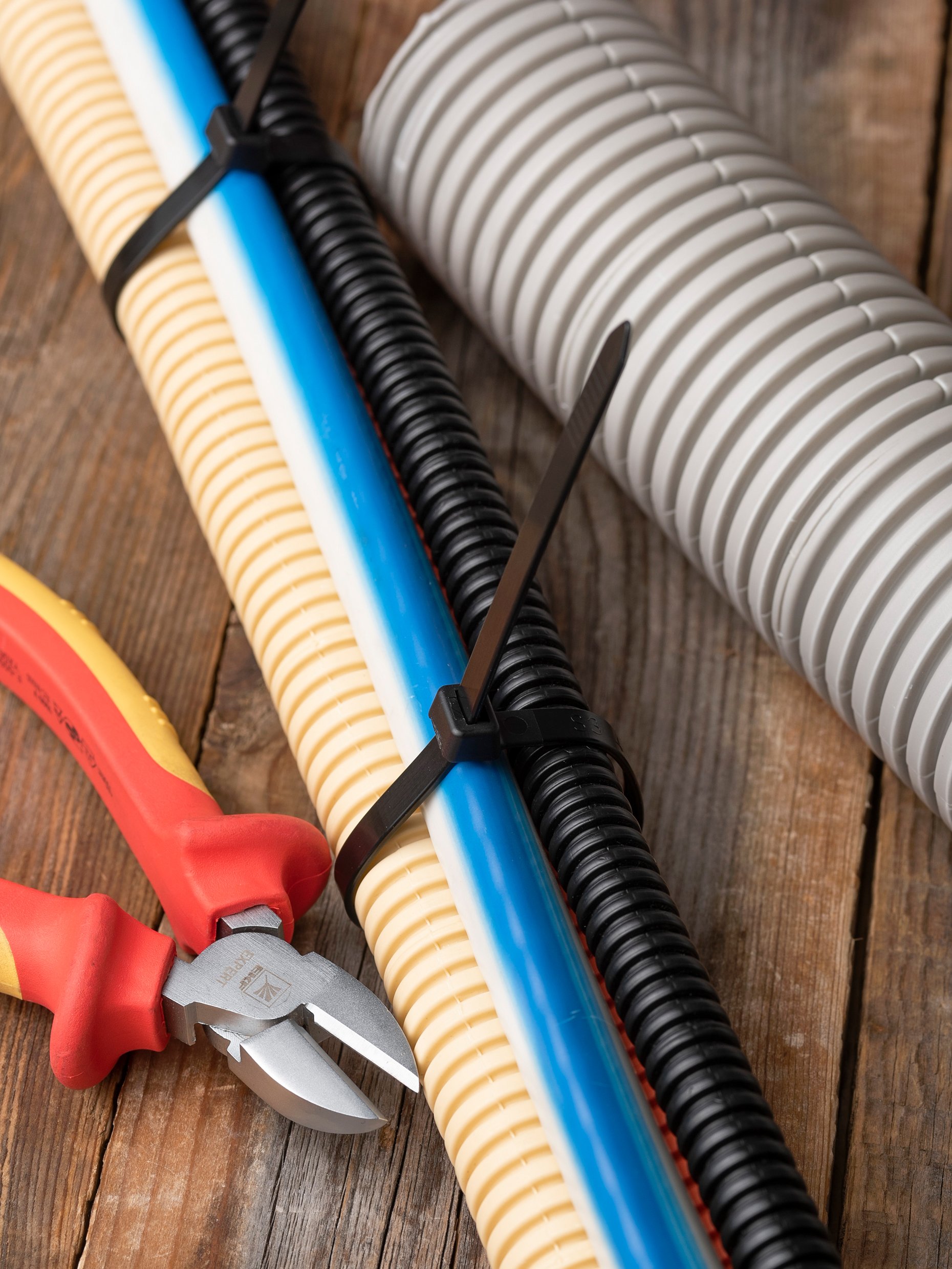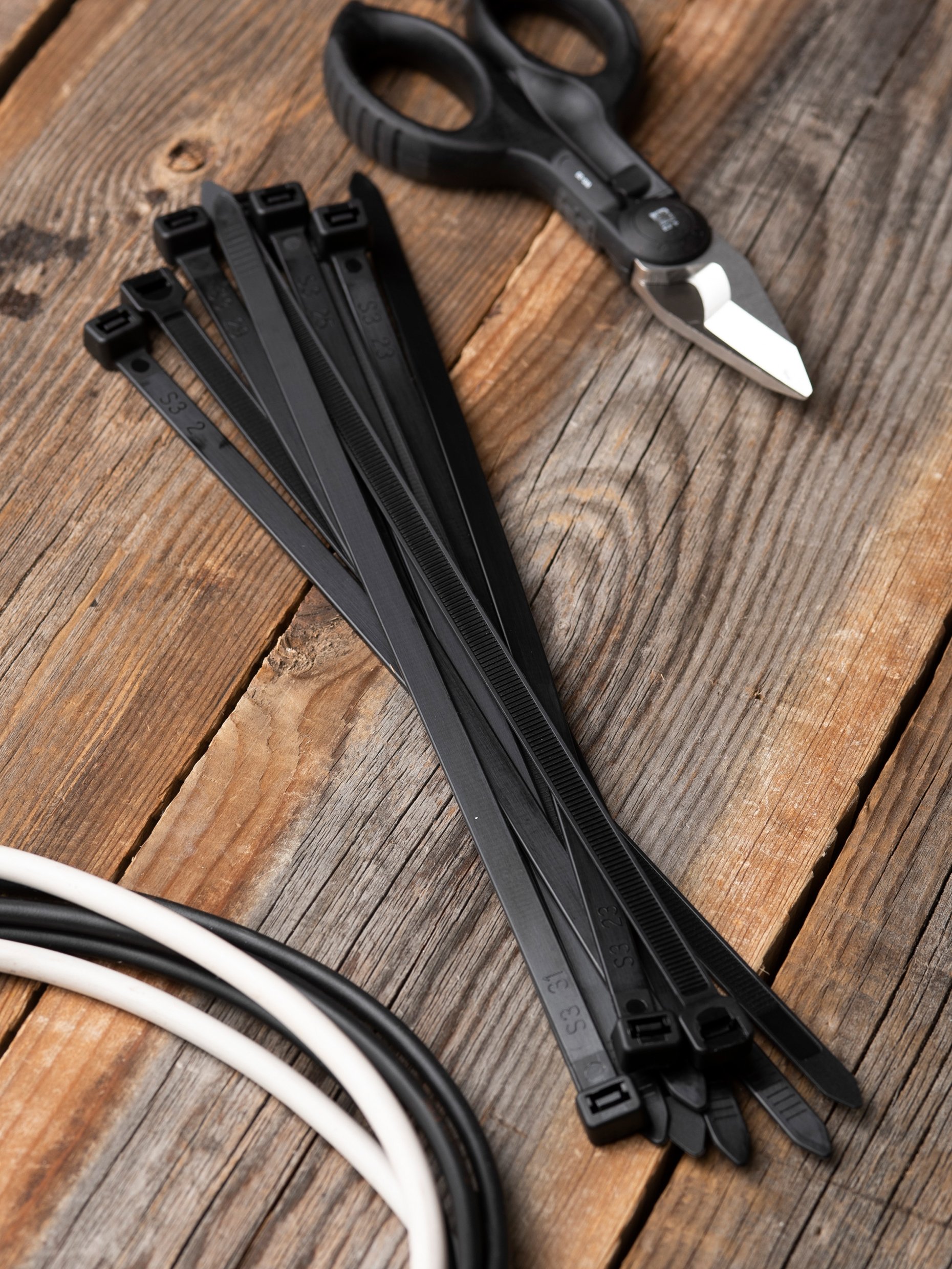 Предназначен для увязки кабелей и проводов в пучок и монтажа кабельных линий и проводников. Ремешок самофиксирующийся, блокирующий механизм. Изготовлен из Nylon 6.6, устойчивого к старению, коррозии, воздействию солей, ультрафиолета, кислот, щелочей, спирта, бензина и масел. При производстве кабельных стяжек черного цвета добавляется угольный порошок, который является одним из наиболее эффективных стабилизаторов. Он улучшает физические свойства продукции в стойкости к погодным условиям и УФ-излучению (прямые солнечные лучи).