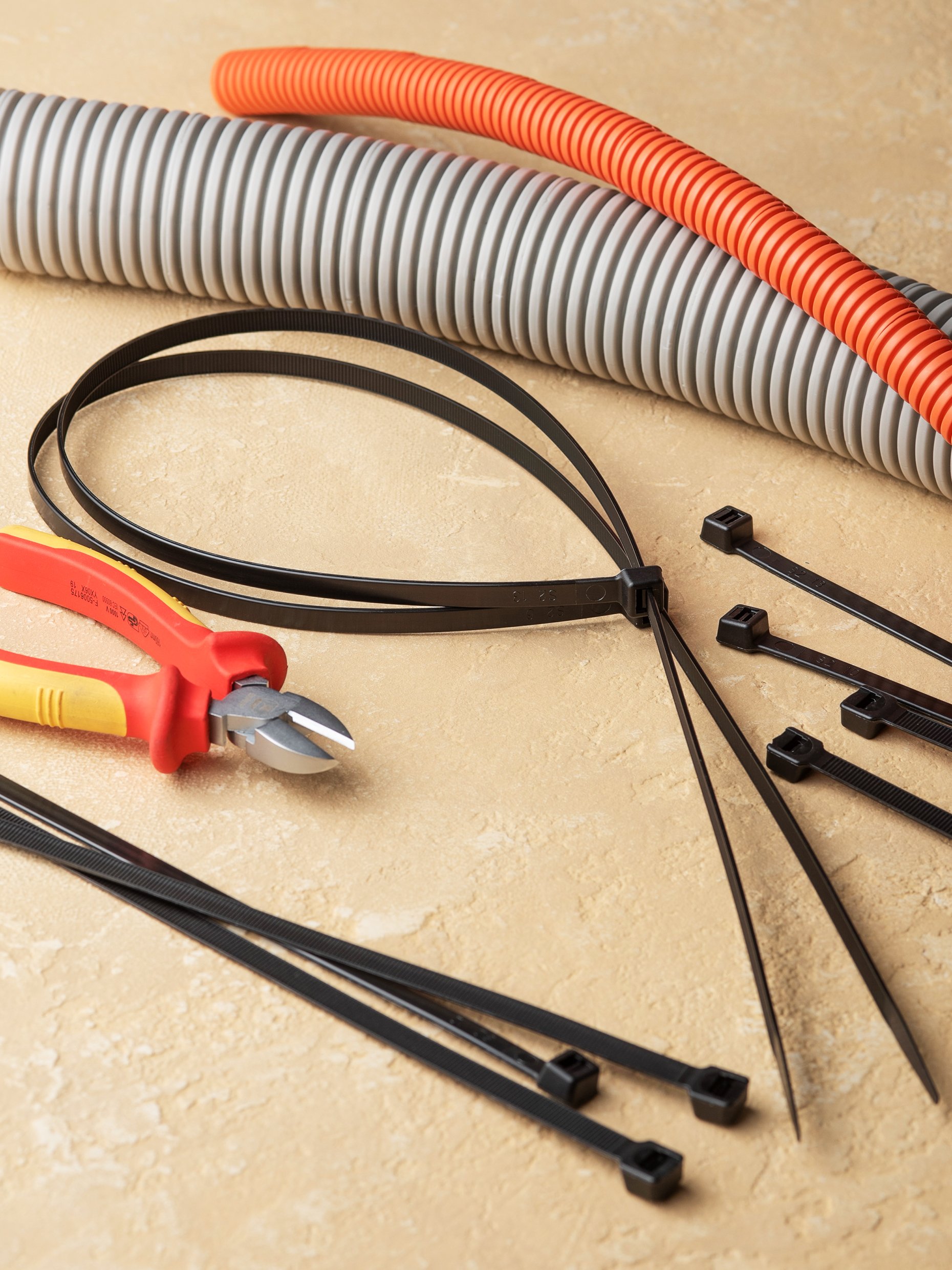 Предназначен для увязки кабелей и проводов в пучок и монтажа кабельных линий и проводников. Ремешок самофиксирующийся, блокирующий механизм. Изготовлен из Nylon 6.6, устойчивого к старению, коррозии, воздействию солей, ультрафиолета, кислот, щелочей, спирта, бензина и масел. При производстве кабельных стяжек черного цвета добавляется угольный порошок, который является одним из наиболее эффективных стабилизаторов. Он улучшает физические свойства продукции в стойкости к погодным условиям и УФ-излучению (прямые солнечные лучи).