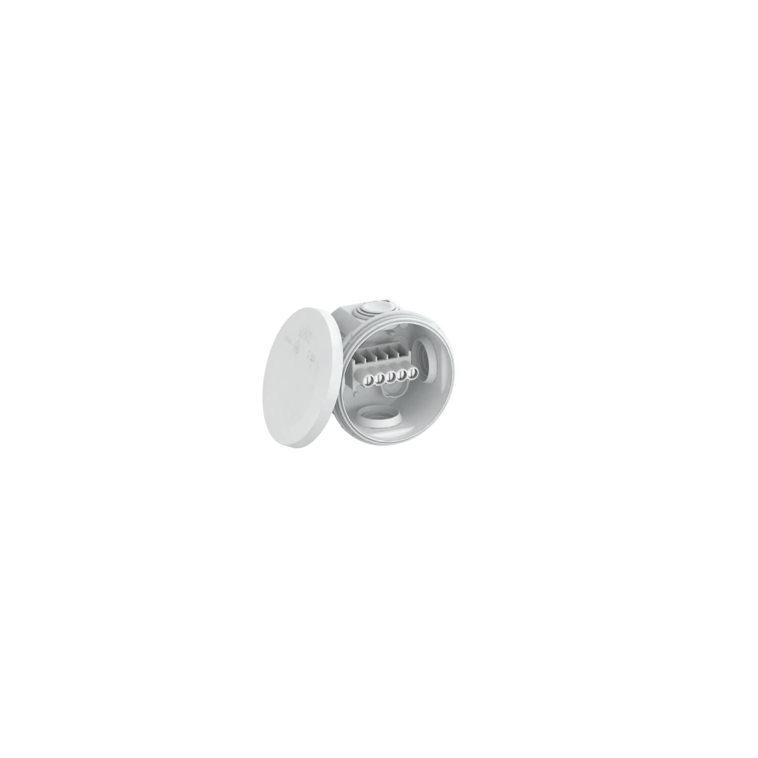 Кабельная распределительная коробка с клеммной колодкой для соединения кабелей и проводов в помещении и в защищенных зонах вне помещения. Круглая форма с вставными уплотнениями по бокам и штамповкой под отверстия на дне. Подходит для настенного и потолочного монтажа и установки на монтажных листах и для резьбы на дне. С возможностью внутреннего закрепления. С несъемной крышкой для клемм. Изготовлено из материалов, не содержащих галогены. Кабельная распределительная коробка согласно DIN EN 60670. Огнестойкость согласно DIN EN 60695-2-11, температура испытания 650 °C. Ударопрочность IK07 согласно DIN EN 50102.