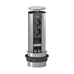 Готовый к подключению настольный бокс DBV предназначен для оснащения рабочих мест розетками для энергоснабжения и телекоммуникационными разъемами. Вертикальный настольный бокс с силовым кабелем предназначен для фиксированного монтажа в столешнице, с пластиковой манжетой для крепления, с лаковым покрытием в тон крышки. Монтаж выполняется через отверстие (Ø 102 мм) в столешнице. Комплектация: - две черные розетки с защитным контактом с углом установки 60°, включая 3,0 м сетевого кабеля с угловым штекером CEE 7/7. - муфта HDMI 1.3, вкл. 3,0 м соединительного кабеля со штекером. - две соединительные муфты телекоммуникационной техники RJ45 на RJ45, переключение 1:1, кат. 6, экранированные. Указание: можно использовать в столешницах толщиной до 50 мм.