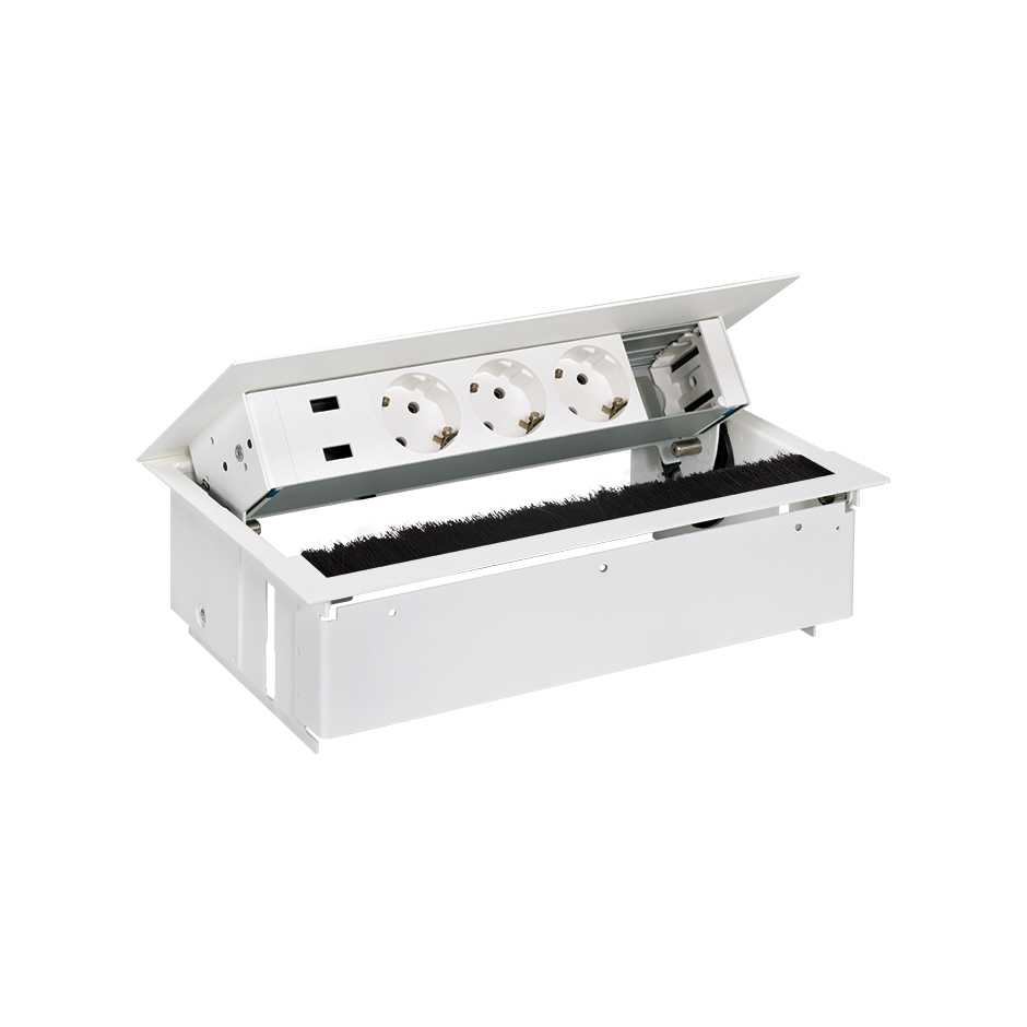 Simon 400 Белый Врезной розеточный блок с крышкой, ввод щетка, 3x2P+E, 2xUSB зарядное уст., 1 пустой модуль от производителя Simon. Артикул производителя 44523000-130.