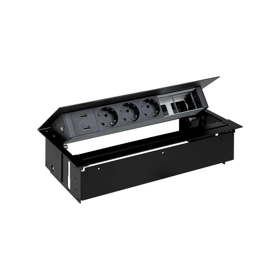 Simon 400 Черный Врезной розеточный блок с крышкой и мет. вводом, 3x2P+E, 2xUSB зарядное уст., 2 пустых модуля от производителя Simon. Артикул производителя 45623000-138.