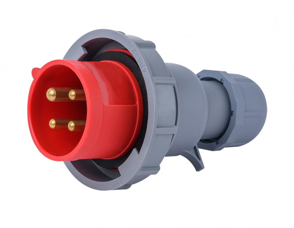Вилка переносная серии ВП-103 Dekraft, номинальный ток 16 А, диапазон рабочего напряжения 380-415 В AC, степень пыле-влаго защиты IP67, количество полюсов 3Р+РЕ, код CEE 014W.