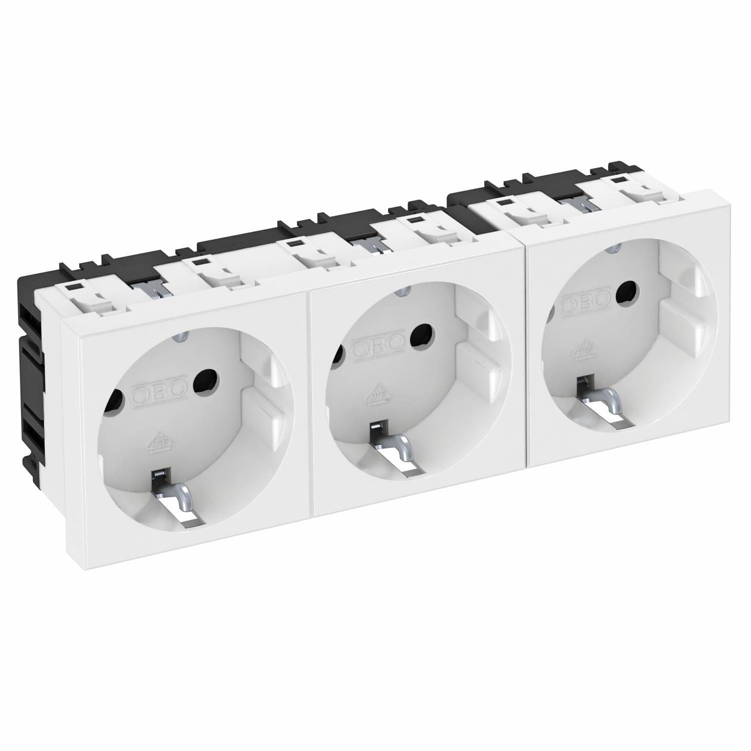 Розетка с заземляющим контактом, тройная 0°, с защитными шторками, с автоматическими клеммами, 2-полюсная, 16 A, 250 V~, автоматические клеммы соответствуют стандарту ГОСТ Р51322.1-2001 МЭК 60884-1:2006.