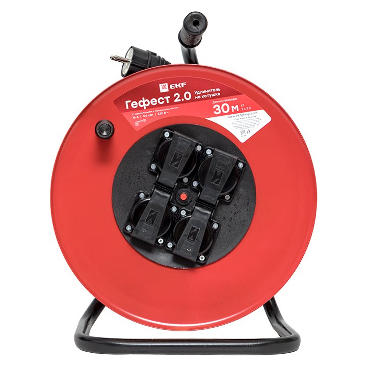 EKF PROxima Удлинитель на катушке "Гефест 2.0" 4 гнезда 30м с заземлением и предохранителем КГ 3*2,5 16А/3,5кВт IP44