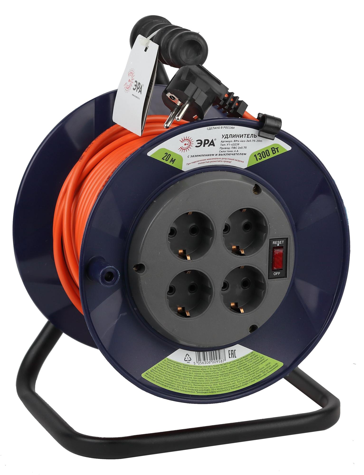 Удлинитель силовой на пластиковой катушке ЭРА RPx-4es-3х0.75-20m с заземлением, с выключателем, ПВС 3х0,75м2, 4 розетки, 20 м. Мощность 6А/1300Вт. Используется для работы на строительных площадках или дачных участках. Удобен при работе с приборами находящимися удаленно от стационарной розетки,. Например, газонокосилки, электрические, пилы, триммеры или электродрели. Провод в удлинителях Эра сделан из 100% меди, что делает его абсолютно пожаробезопасным. Рама удлинителя сделана из высокопрочной стали а пластиковой корпус выполнен с применением негорючих добавок.