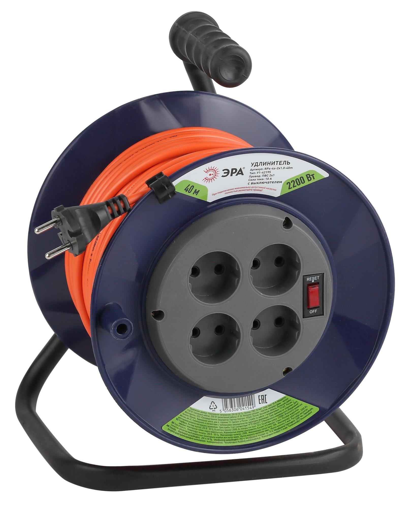 Удлинитель силовой на пластиковой катушке ЭРА RPx-4s-2x1.0-40m с заземлением, с выключателем, ПВС 2х1м2, 4 розетки, 40 м. Мощность 10А/2200Вт. Используется для работы на строительных площадках или дачных участках. Удобен при работе с приборами находящимися удаленно от стационарной розетки. Например, газонокосилки, электрические, пилы, триммеры или электродрели. Провод в удлинителях Эра сделан из 100% меди, что делает его абсолютно пожаробезопасным. Рама удлинителя сделана из высокопрочной стали а пластиковой корпус выполнен с применением негорючих добавок.