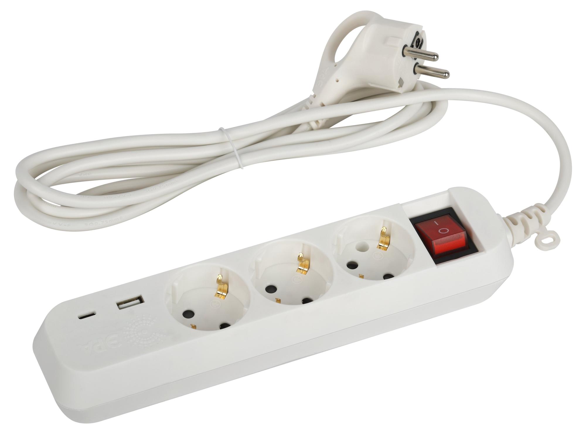 Удлинитель электрический ЭРА UB-3es-1,5m-USB с заземлением, с выключателем, 3 розетки, 1,5м ПВС 3x0,75мм2. Рассчитан на максимальную мощность 10А/2200Вт. 2-мя USB гнездами (Type A и Type C) для зарядки портативных устройств. Максимальная мощность USB разъемов: 2400 мА. Новые удлинители ЭРА с USB разработаны и произведены в России. Удобная кнопка включения позволяет отключать электроприборы, не выдёргивая вилку удлинителя из сети. Для комфортного извлечения вилка удлинителя имеет гибкое кольцо. Глубокие гнёзда удлинителей ЭРА с USB-портами надёжно фиксируют вилки электроприборов. Прочный и гибкий трёхжильный провод - залог электробезопасности и долговечности данных приборов. Разветвители и удлинители ЭРА с USB изготовлены из пожаробезопасных материалов, в составе которых присутствуют препятствующие горению антипирены. Корпусы ударопрочны. Доступен выбор длины шнура - 1,5, 3 или 5 метров.