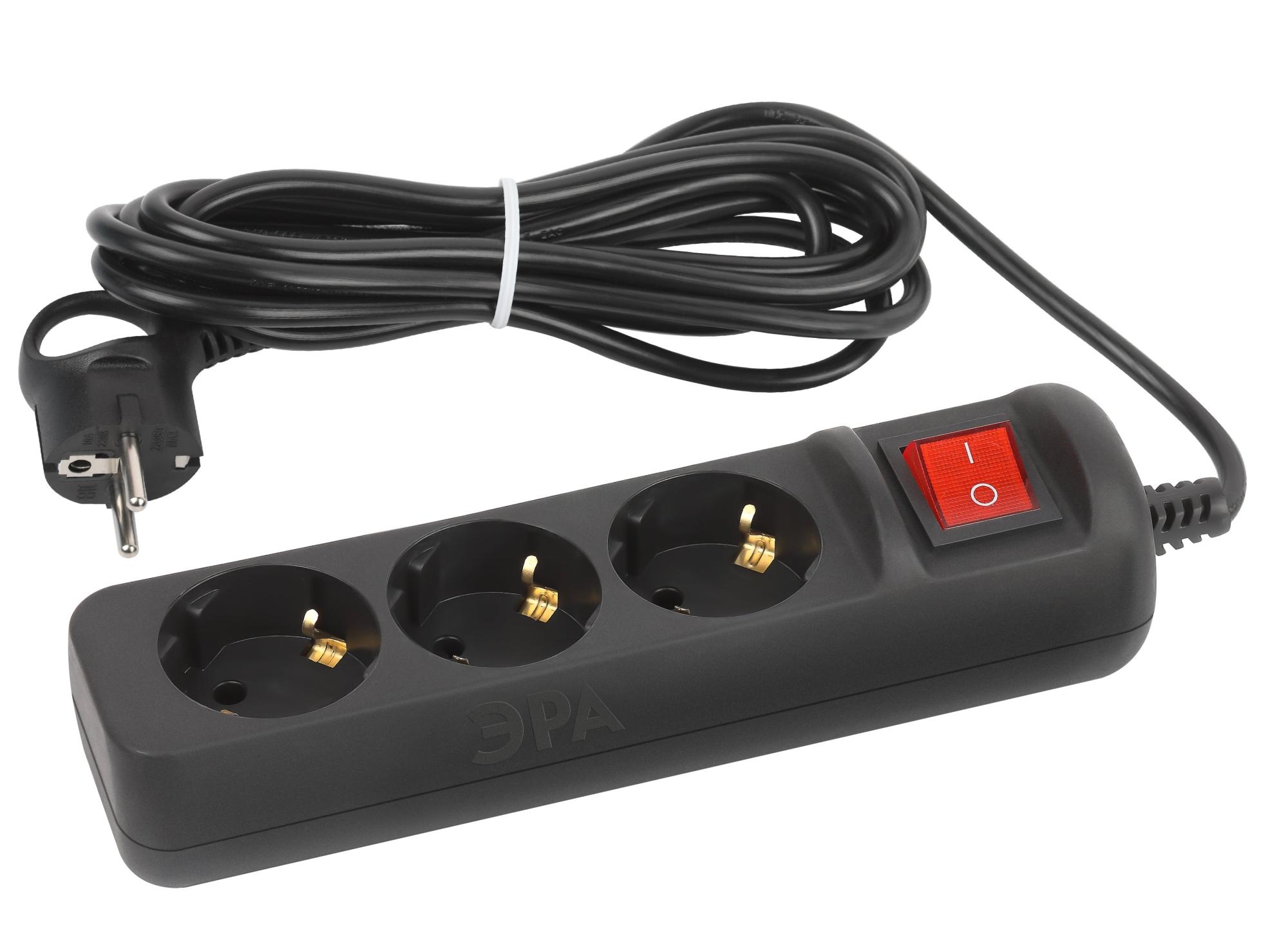 Удлинитель электрический Эра UX-3es-5m-B с заземлением, с выключателем, черный, 5 розетки. Провод ПВС, 3x0,75мм2, 5м. Рассчитан на максимальную мощность 10А/2200 Вт. Удлинитель Эра станет Вашим надежным помощником, если Ваши любимые электроприборы находятся далеко от розеток. Провод в удлинителях Эра сделан из 100% меди, что делает его абсолютно пожаробезопасным. Корпус выполнен из ударопрочного и негорючего пластика (полипропилен). Вилка обеспечена кольцом для удобного извлечения ее из розетки. Модель удлинителя на 10А позволяет подключить бытовые приборы общей нагрузкой до 2200Вт. Дизайн удлинителя разработан в России командой Эра Style.