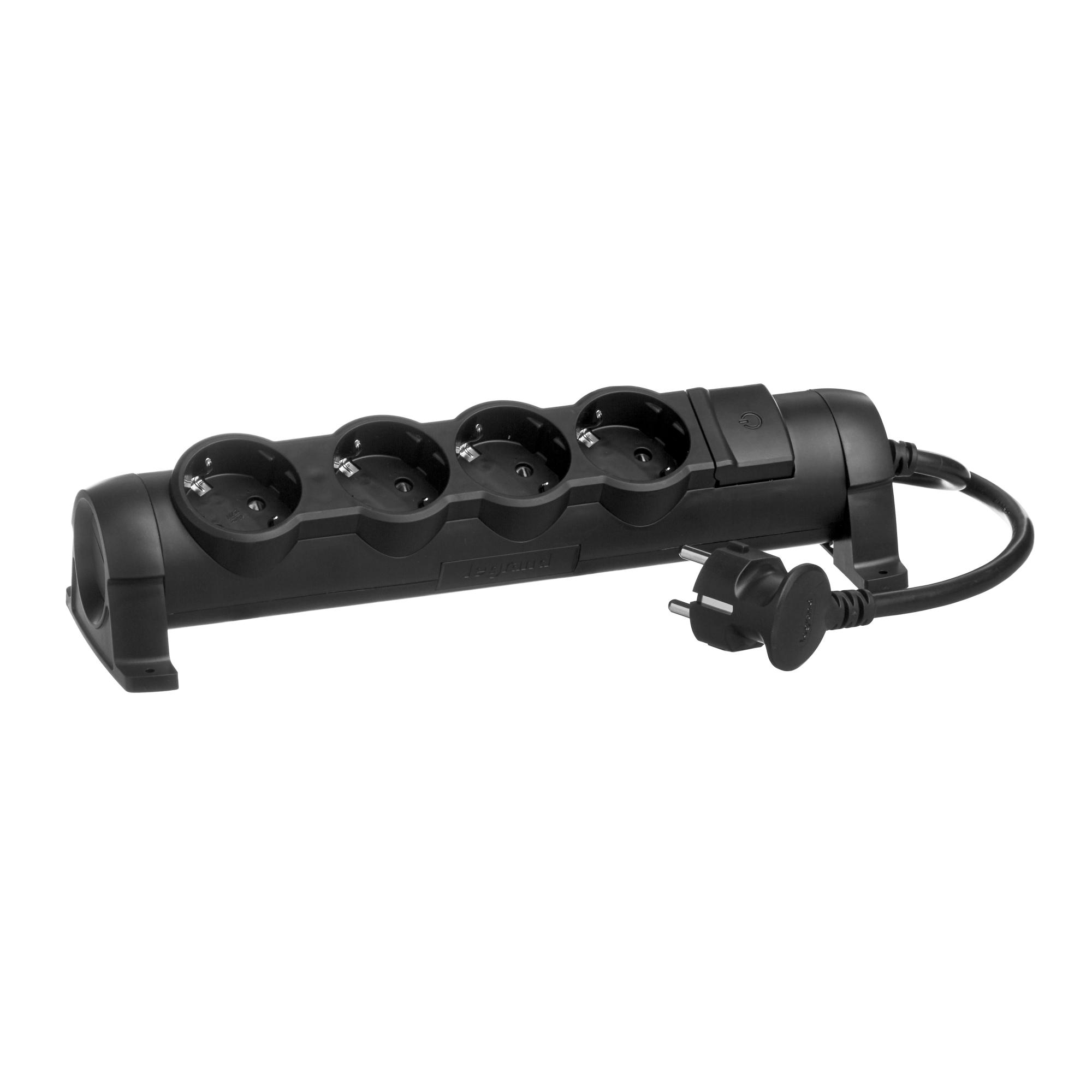 Legrand Комфорт Черный Удлинитель 4x2К+З с выкл., кабель 1,5м, фиксир. поворотный блок, возможно крепление к стене от производителя Legrand. Артикул производителя 694604.