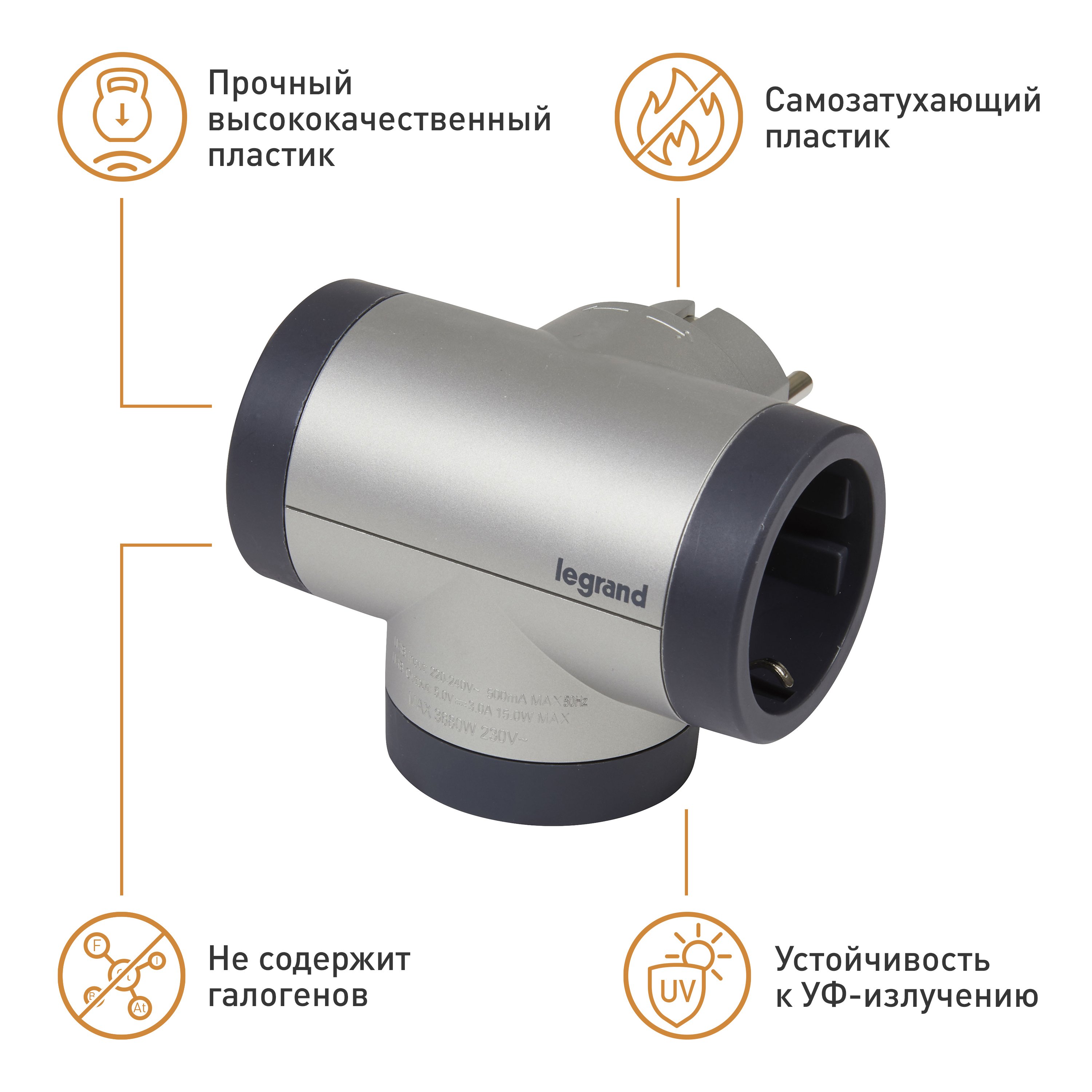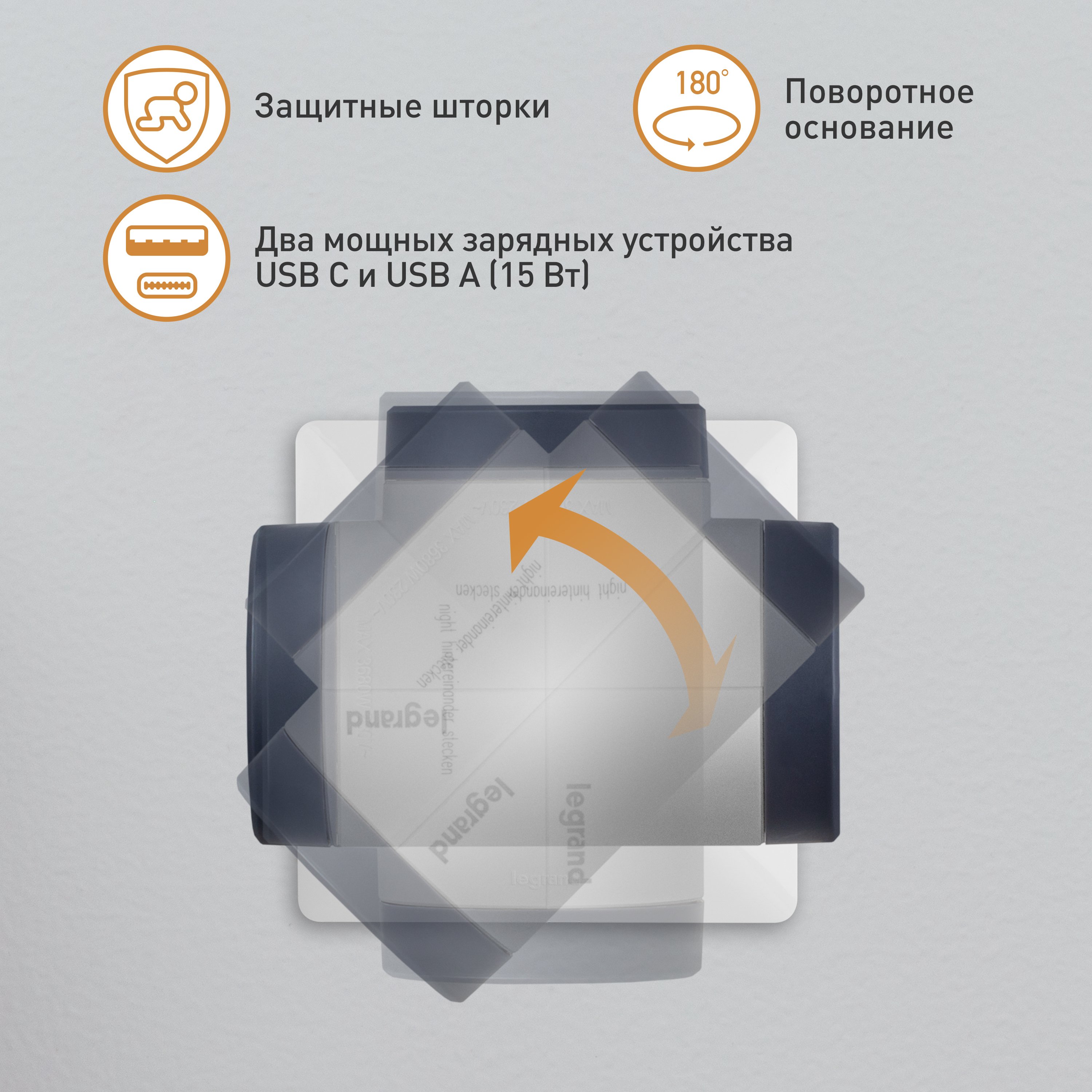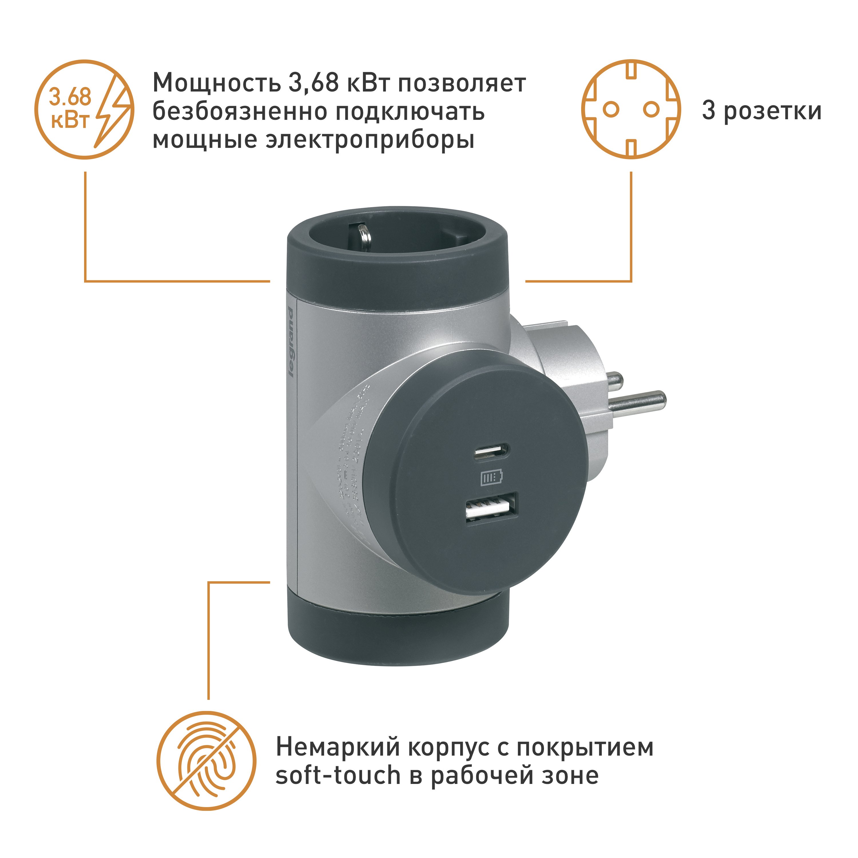 Legrand Revolution Комфорт Алюминиево-черный Тройник 2x2К+З с 2xUSB A+C (3А), фиксируемый поворотный блок от производителя Legrand. Артикул производителя 694524.