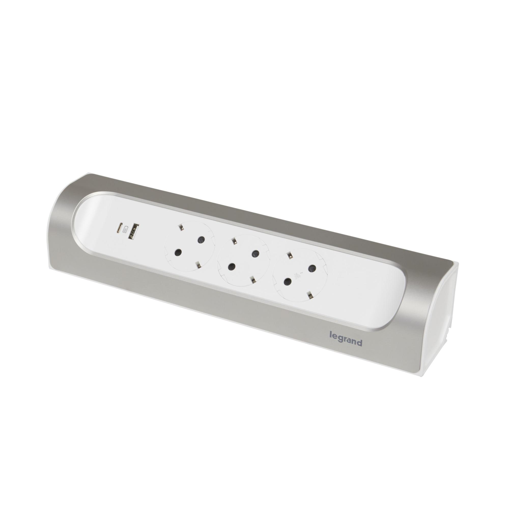 Legrand Revolution Комфорт Бело-алюминиевый Удлинитель угловой 3x2К+З с 2xUSB A+C (3А), без кабеля, плоские розетки от производителя Legrand. Артикул производителя 694504.