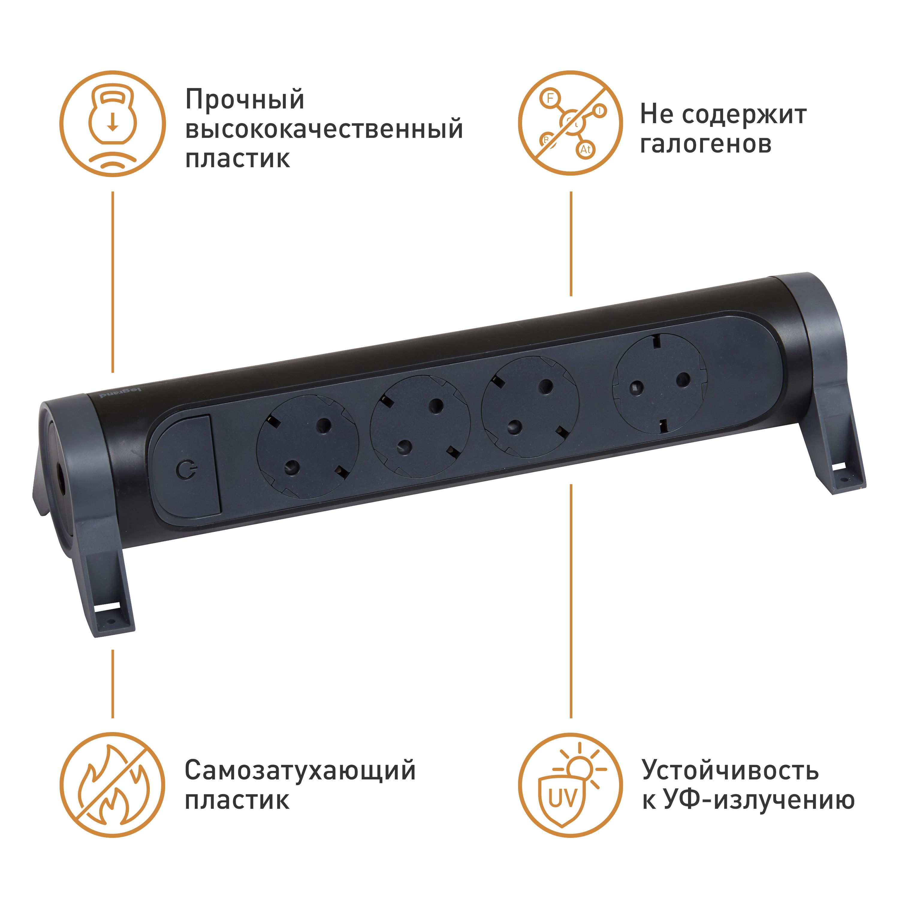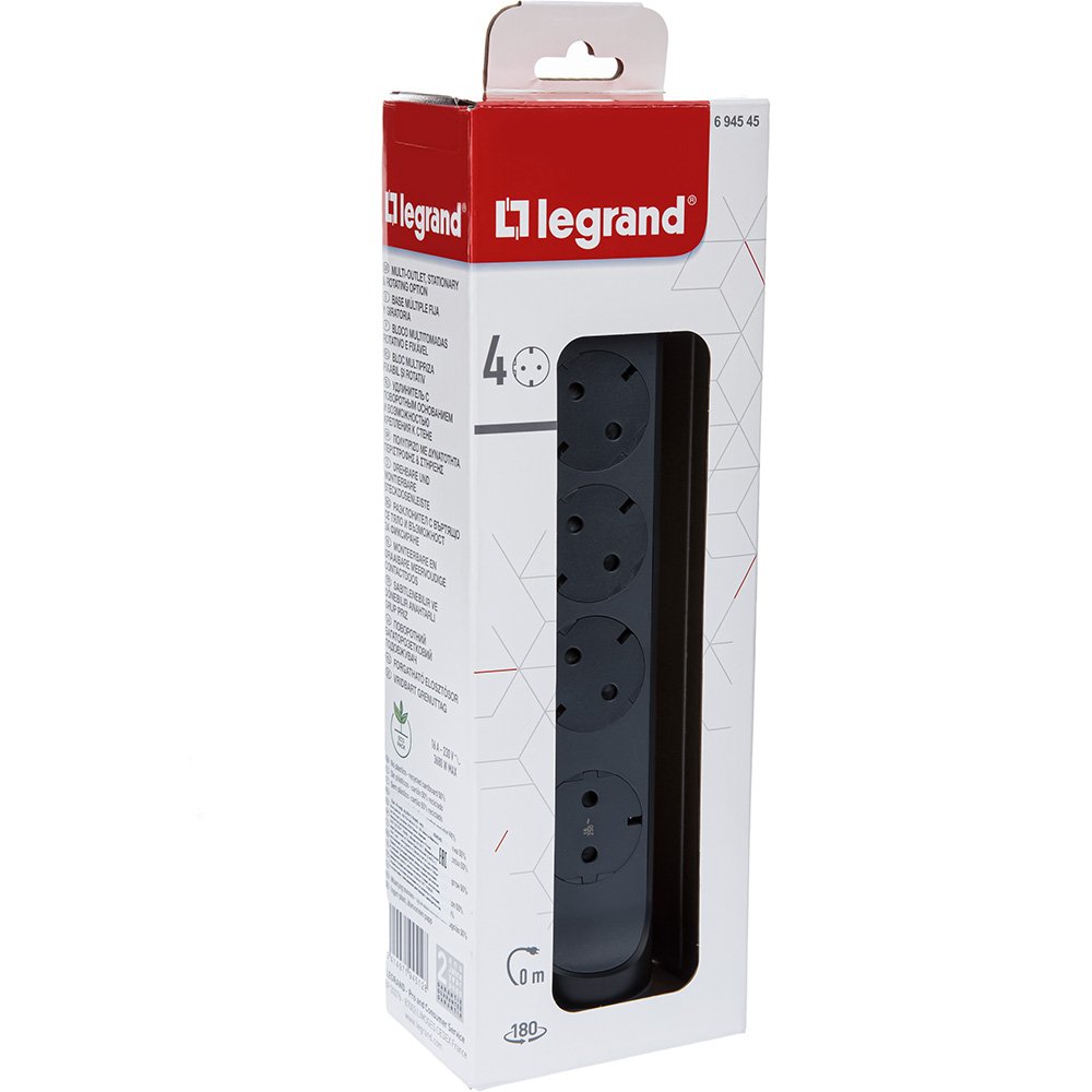 Legrand Revolution Комфорт Черный Удлинитель 4x2К+З с выкл., без кабеля, плоские розетки, фиксируемый поворотный блок от производителя Legrand. Артикул производителя 694545.
