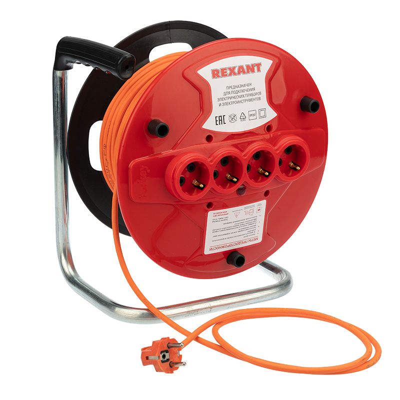 Шнур-удлинитель на катушке REXANT с 4 гнездами предназначен для подключения электрическиx приборов и электроинструмента, когда недостаточно стандартной длины шнура для питания от стационарныx розеток.