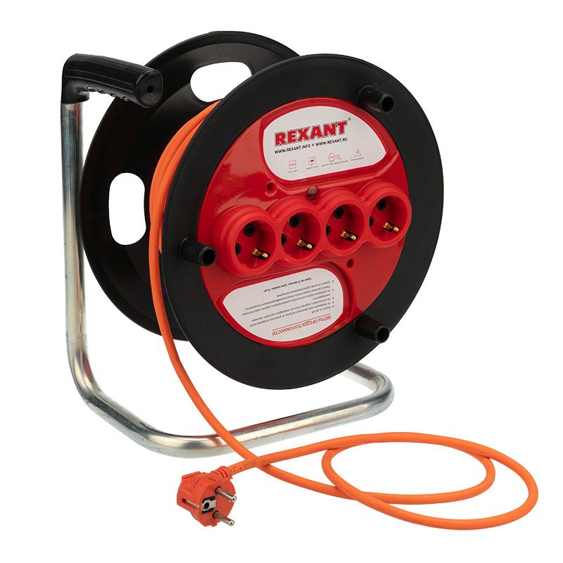 Шнур-удлинитель на катушке REXANT с 4 гнездами предназначен для подключения электрическиx приборов и электроинструмента, когда недостаточно стандартной длины шнура для питания от стационарныx розеток.