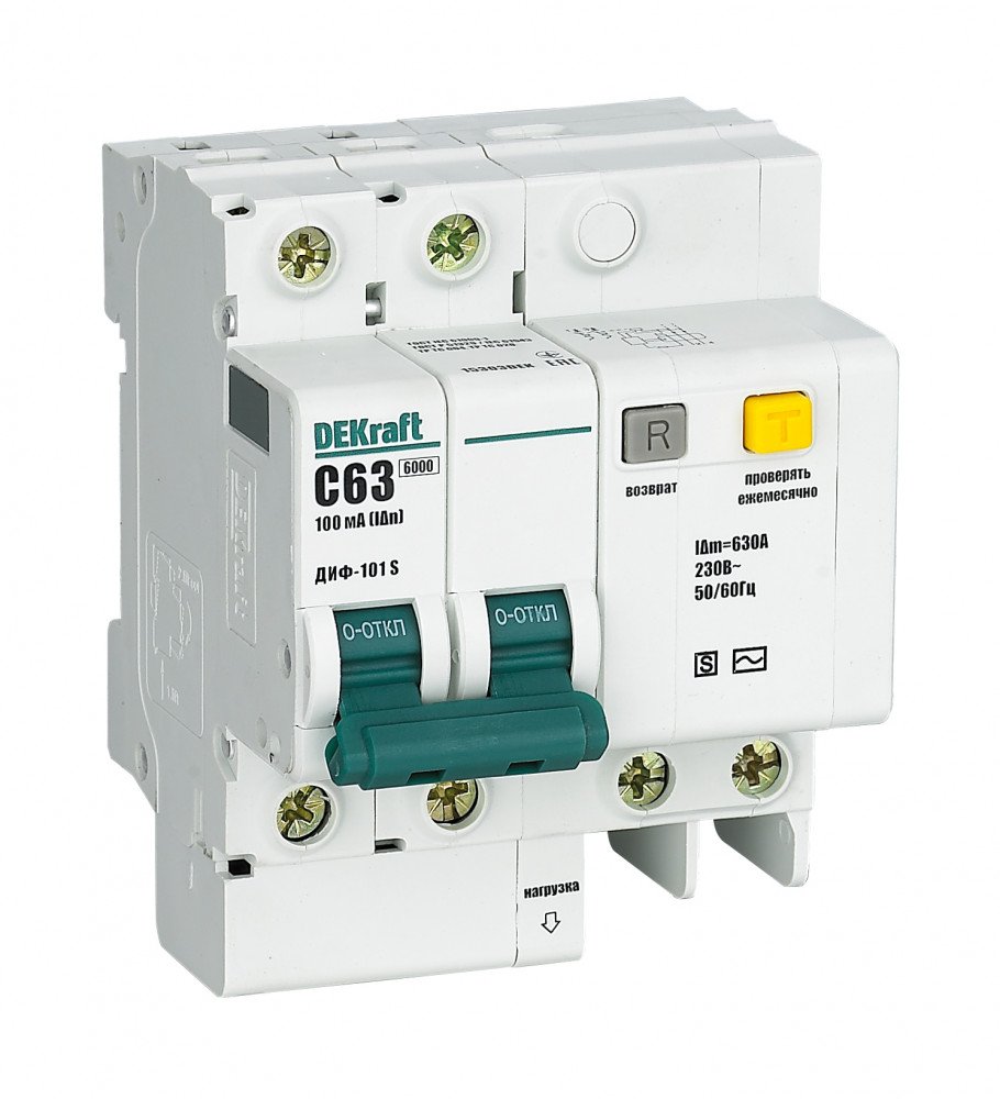 Автоматический выключатель дифференциального тока серии ДИФ-101 S Dekraft; селективный; 2P; ном.ток 63 А; характеристика C; откл.способность Icn = 6 кА; ток утечки 100 мА; блок дифф.защиты – электронный; ширина – 4 мод. х 18 мм; монтаж – на DIN-рейку. АВДТ применяются в сетях напряжением до 400 В пер.тока для защиты электроустановок от сверхтоков и токов утечки; в щитах, где требуется ступенчатая дифференциальная защита (задержка по срабатыванию).