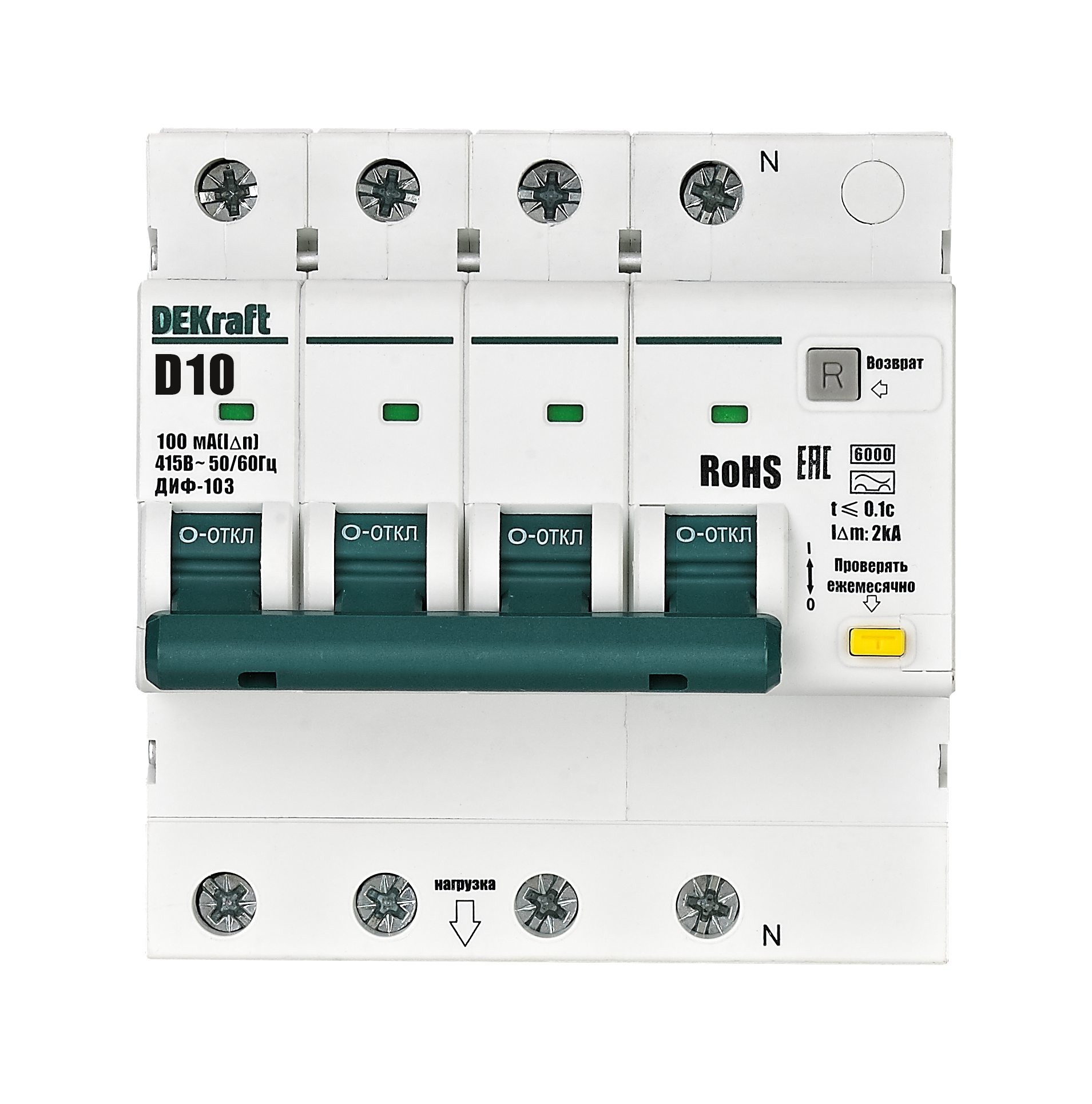 Автоматические выключатели дифференциального тока серии ДИФ-103 6кА NEW Dekraft; 3P+N; номинальный ток 10 А; ном. диф. ток 100 мА; тип диф. расцепителя - AC; кривая отключения - D; Icn, Ics = 6 кА; тип устройства - электронный; монтаж – на DIN-рейку. АВДТ обеспечивают три вида защиты — от короткого замыкания, перегрузки и возникновения утечки тока (в частности, вследствие прикосновения человека к токоведущим частям).
