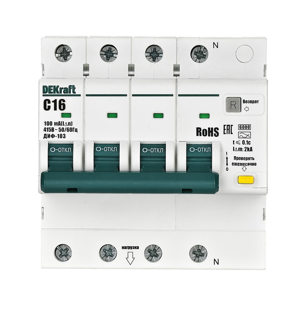 Автоматические выключатели дифференциального тока серии ДИФ-103 6кА NEW Dekraft; 3P+N; номинальный ток 16 А; ном. диф. ток 100 мА; тип диф. расцепителя - A; кривая отключения - С; Icn, Ics = 6 кА; тип устройства - электронный; монтаж – на DIN-рейку. АВДТ обеспечивают три вида защиты — от короткого замыкания, перегрузки и возникновения утечки тока (в частности, вследствие прикосновения человека к токоведущим частям).