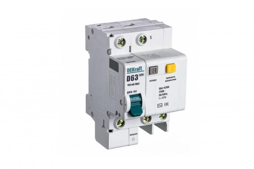 Автоматический выключатель дифференциального тока серии ДИФ-101 Dekraft; 1P+N; ном.ток 63 А; характеристика D; откл.способность Icn = 4,5 kA; ток утечки 100 мА; блок дифф.защиты – электронный; ширина – 3 мод. х 18 мм; монтаж – на DIN-рейку. АВДТ применяются в сетях напряжением до 220 В пер.тока для защиты электроустановок от сверхтоков и токов утечки. Для расширения функционала АВДТ возможно использование аксессуаров от выключателей серии ВА-101.
